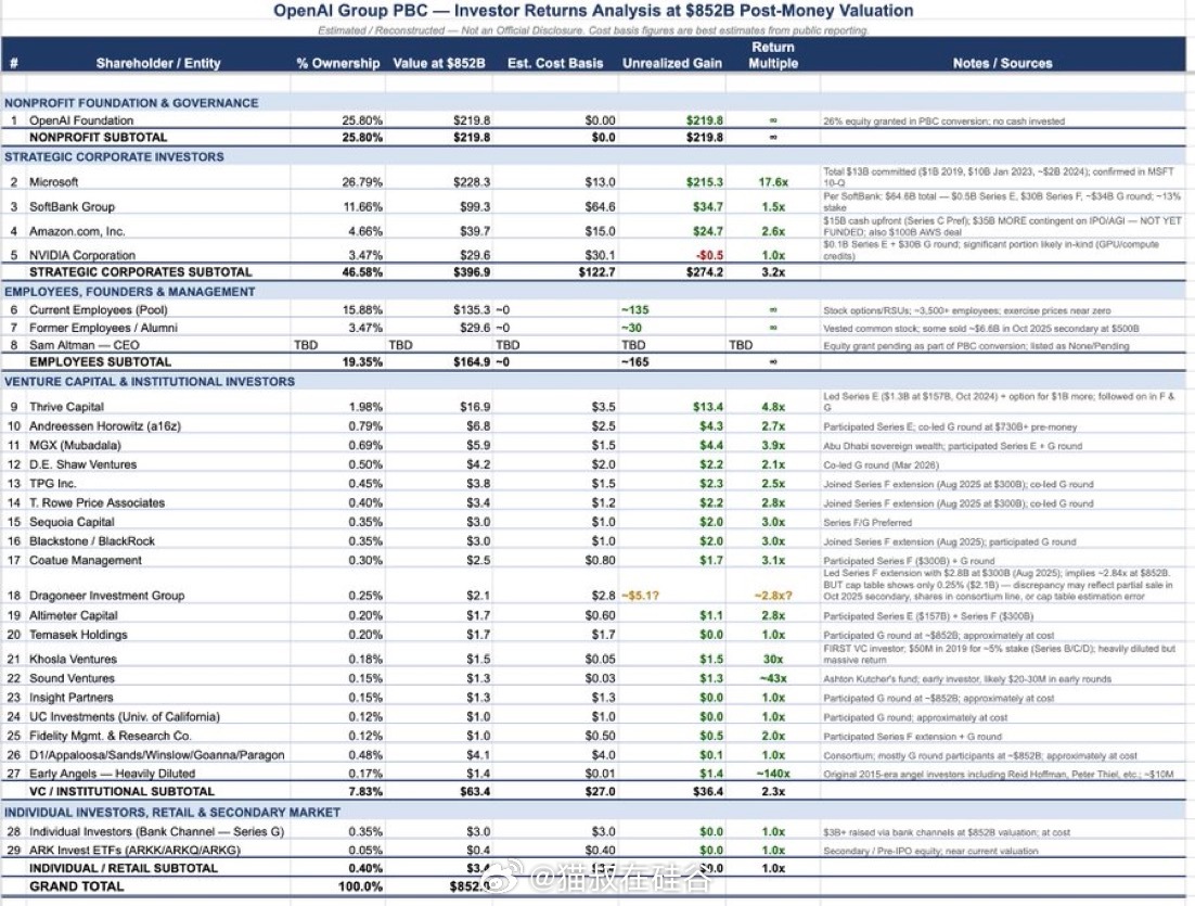 而另一边则是后期入场的大额资金: SoftBank 砸下 646 亿美元,回报仅 1.5 倍。 英伟达投入 301 亿美元,目前亏损约 5 亿美元。 Dragoneer 投入 28 亿美元,也处于浮亏状态。