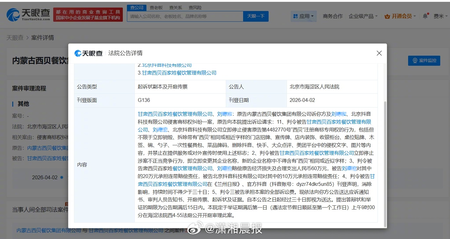【#西贝起诉疑似碰瓷公司索赔60万#】#西贝起诉同名餐饮公司侵权#天眼查App显示,近日,北京市海淀区人民法院向甘肃西贝百家姓餐饮管理有限公司公告送达原告内蒙古西贝餐饮集团有限公司与被告刘某、北京抖音科技有限公司及该公司侵害商标权纠纷一案应诉通知书、开庭传票等,自本公告之日起经过三十日即视为送达。该案将定于举证期满后第一日公开开庭审理。