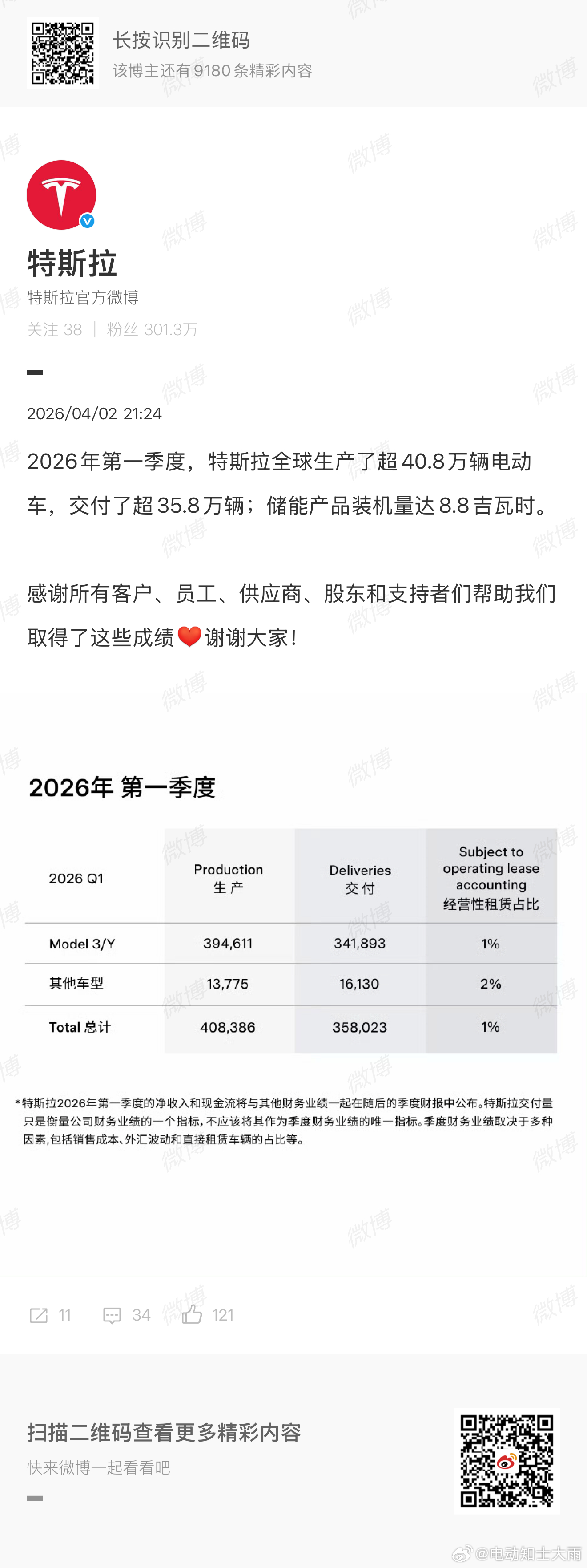 特斯拉Q1交付35.8万辆,低于华尔街预期。