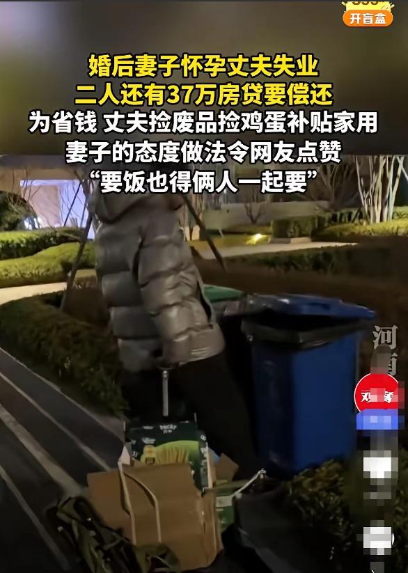 太佩服了!辽宁,一男子婚后失业,还有37万房贷要还,老婆此时又怀孕,为了省钱,捡废品,捡鸡蛋,老婆没有抱怨和嫌弃,选择和老公一起承担,网友:有这样的老婆,就算生活再难都不会被打败… 辽宁小伙被公司裁员,37万房贷压顶,妻子却在这时怀孕,不敢进菜市场的他,捡废品、捡鸡蛋,甚至一度想瞒着妻子打零工。 直到那天,他在路边捡纸壳时被撞见,妻子没有哭闹也没有嫌弃,只是默默蹲下来一起收拾, 这个不是故事,是真实发生在2026年春天辽宁的一件事。 这大哥原本在一家本地私企当业务主管,日子不算宽裕但也过得去,两年前倾尽积蓄买了房,首付掏空了存款,剩下37万房贷分十年还。 结果年后公司业务萎缩,他被列入了第一批裁员名单,拿到离职补偿那一刻,他心里还盘算着年后重新找个工作也不算难。 谁知道投出去四十多份简历,连面试通知都没接到几个,就在他焦头烂额跑招聘会的时候,妻子把验孕棒递到他面前——两条杠。 这哥们当时脑子一片空白,卡里存款见底,房贷每月雷打不动近四千,产检建档、营养品、待产包哪样不要钱,他老婆本来在商场做销售,怀孕后孕吐严重根本没法站柜台,索性也辞了职,家里彻底断了收入。 他不敢把这个负担甩给妻子,每天早上依然出门,假装去面试,实际上在街边翻垃圾桶,快递站门口废弃的纸箱,早餐店门口扔的饮料瓶,只要能卖钱的他都捡,路上遇到熟人恨不得把脸埋进衣领里,生怕被人认出来。 最难为情的是翻菜市场后门的垃圾堆,那种泔水混合烂菜叶的酸臭味沾在衣服上怎么都洗不掉。 有一天他捡到一个破纸箱,里面竟然滚出来五六枚鸡蛋,只有一枚摔裂了,其他的都完好,他蹲在原地愣了足足半分钟,把好的几枚小心翼翼揣进口袋,裂开的那个用小塑料袋包好带回家热了给妻子吃。 直到有天他正在路边翻纸箱,妻子突然出现在身后,他本能地挡住脸,下意识想解释点什么,却一句话都说不出来,但接下来的一幕,让他整个人愣住了,妻子没哭也没闹,更没有嫌弃的表情,只是走过来蹲下来帮他一起把散落在地上的纸板叠整齐,然后拍了拍他的肩膀。 那顿饭吃得特别安静,也特别踏实,往后的日子,妻子每天早上把饭菜装好让他带上,他翻垃圾桶的时候,妻子在街对面的长椅上坐着晒太阳等他。 一家超市的保洁阿姨看这对小夫妻可怜,把废纸箱留给他们,楼下早餐店老板知道了情况,每天多蒸几个包子让他们带回去。 街坊邻居把不用的旧衣服洗干净叠整齐送过来,快递站的小哥把废纸箱和塑料瓶攒好专门等他们来取。 这大哥现在一边捡废品一边跑外卖,攒了点钱给妻子买了一罐孕妇奶粉,他说剩下的房贷总有还完的那天,孩子也总会健健康康落地,妻子在短视频平台上发了一条日常,配文写着:日子再难也是一家三口一起扛。 有网友看完视频红了眼眶,说这哪是什么穷困潦倒,分明是贫贱夫妻百事举, 一个男人为了家弯腰捡垃圾不可怕,可怕的是一个人扛着往前走回头发现身后空无一人。 这对夫妻告诉我们,婚姻最贵重的不是彩礼和房本上的名字,而是那张检出了两条杠的验孕棒前面,有一个人愿意陪你一起等结果。