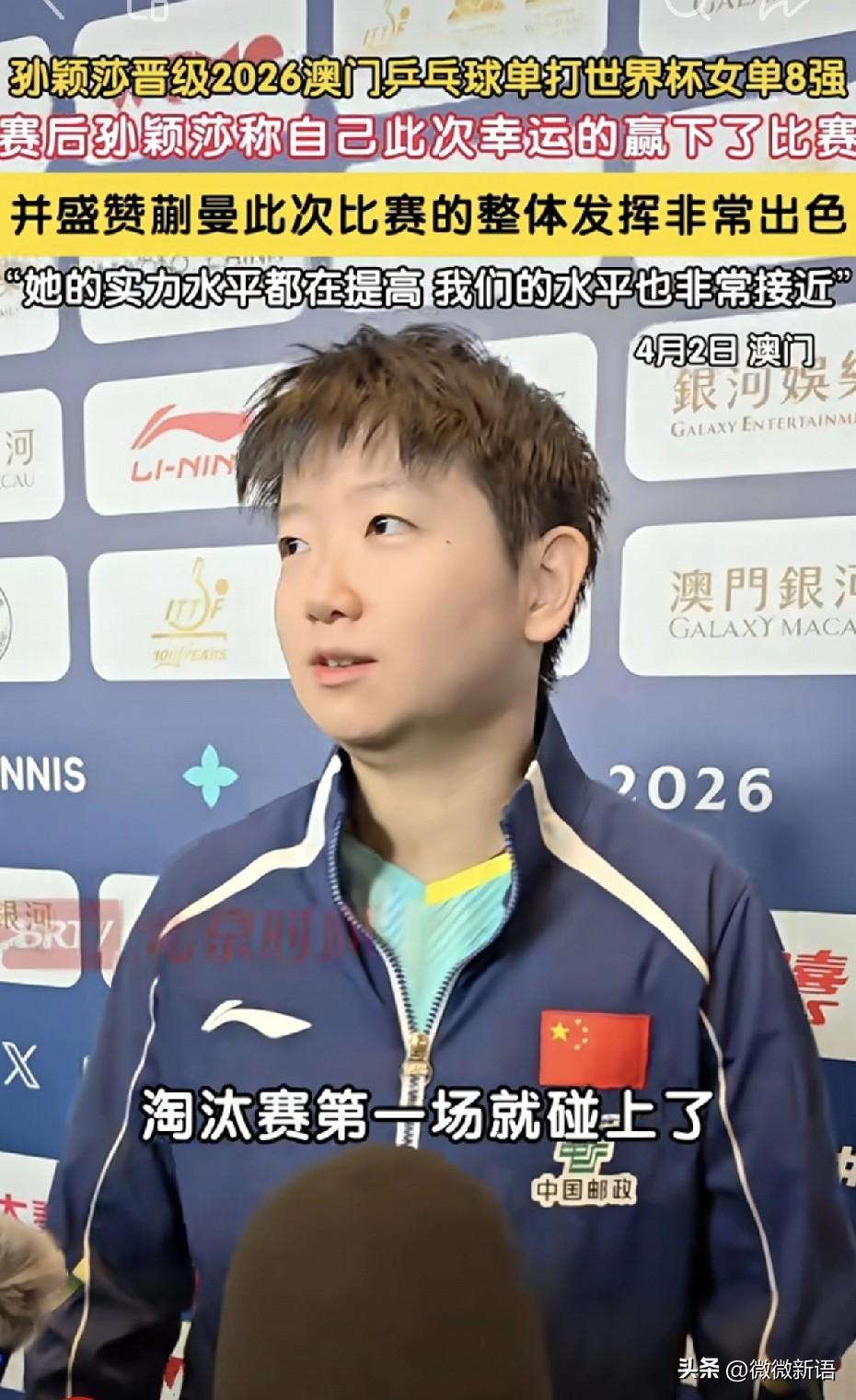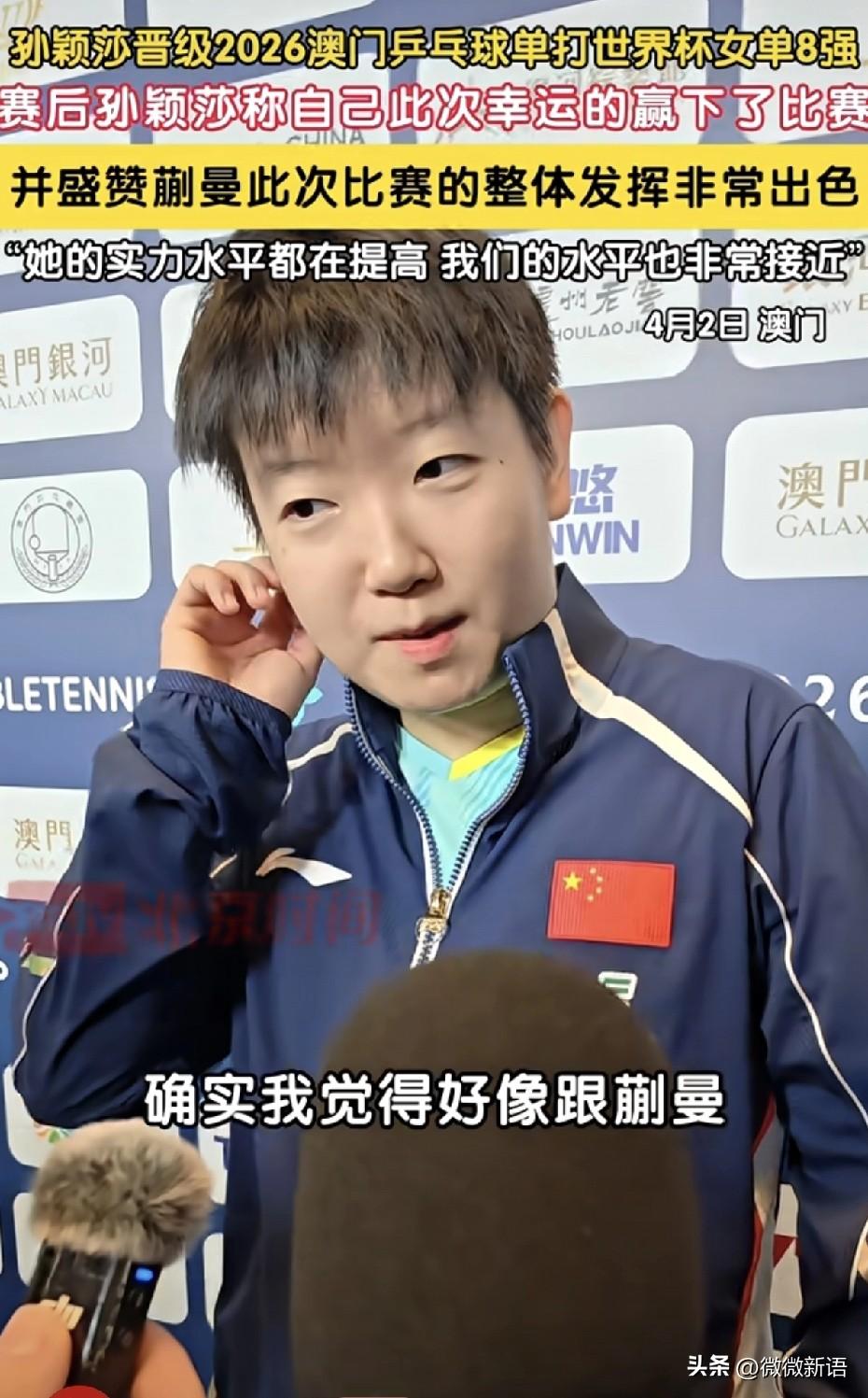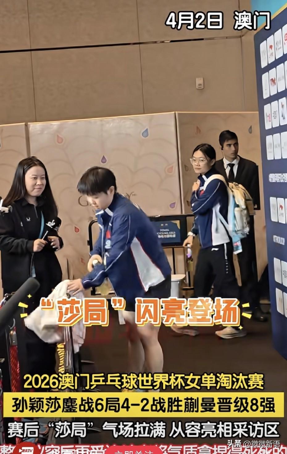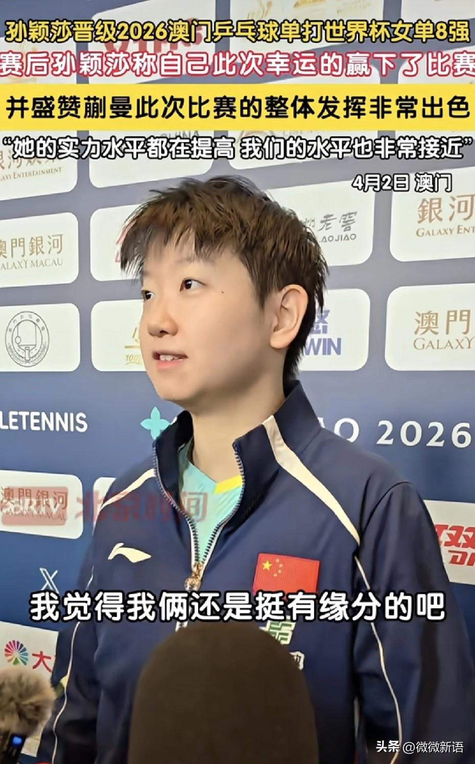 莎莎笑着说:“确实我觉得好像跟蒯曼,我觉得我们俩还是挺有缘分的,去年的时候在这里是在决赛遇上了,今年淘汰赛第一场就遇上了。”懂得都懂,确实现在蒯曼没有了自己的种子位后,就经常在莎莎的半区里。 莎莎真的每次不管输赢永远是积极的心态,赢了会肯定对手,输了也会恭喜对手,真的是很好的小女孩儿。赛后莎莎也是一直肯定蒯曼的进步,说蒯曼也是一直在进步,现在两个人的水平很接近,这次自己是幸运的赢下了比赛,莎莎一直都是这么谦虚,她说比赛时自己是拼着去打。在第四局比赛时,莎莎叫了暂停,她当时肯定也想把第四局拿下,如果大比分成了1-3就不好追了,如果打成2平,后面还能好打一点。 在第四局莎莎赢下来后,蒯曼去换了球衣,莎莎坐在那里喝水,看到蒯曼去换衣服,她也站起来和裁判示意,自己也去换衣服,这样衣服没那么湿,会更好的在赛场上发挥。比赛结束后,看到任姐帮莎莎背着小白包,站在旁边等莎莎采访,任姐把莎莎照顾的也很好,接下来的比赛一场比一场难打,莎莎继续加油哦!