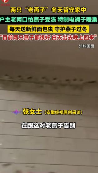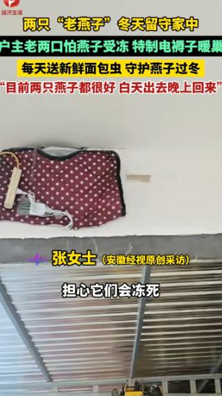 河北,两只 “老燕子” 无力南飞,留户主家过冬。没想到,户主老两口给两只燕子买了电褥子盖上,每天送新鲜面包虫给它们吃。 一段河北小村庄的暖心片段在网上走红,起因是两只年迈燕子因体力不支,未能跟上迁徙大部队,滞留在当地一户农家屋檐下。 北方冬天夜里气温低至零下,燕子若无人照料难以越冬,村里老人都说,活了一辈子从未见过燕子留在北方过冬,不少村民感慨其可怜,却无人主动援手。 收留这两只燕子的,是村里一对普通老两口。 他们一辈子种地守着老房子,儿女常年在城里打拼,家中平日里冷清安静。 偶然发现屋檐下这两只羽毛杂乱、翅膀无力的燕子后,老两口心生不忍,商量后决定尽己所能,帮这两条小生命熬过寒冬,没有任何功利心思,只是单纯不愿看着生命消逝。 照料燕子的首要难题是保暖。 北方寒风凛冽,屋檐下的燕巢根本无法抵御严寒。 大爷独自揣着钱,骑电动三轮车赶十几里土路去镇上,特意挑选了最小号的电褥子。 购买时,他反复向老板确认电褥子是否可调节温度、是否会烫伤小鸟,直到老板现场演示确认安全,才放心将电褥子抱回家。 回到家后,大爷搬来梯子,小心翼翼爬到屋檐下,生怕惊动窝里的燕子。 他先细心整理燕巢,再将电褥子轻轻铺在巢内,盖上一块干净软布,既保证温暖,又避免电褥子直接接触燕子。 保暖问题解决后,食物又成了新的难题。 燕子不吃米和面,只以虫子为食,而北方冬天的野外几乎看不到虫子。 老两口向村里年轻人打听后,得知花鸟市场有适合小鸟的食物。 第二天一早,大妈专程前往镇上花鸟市场,了解到新鲜面包虫营养丰富、易于消化,最适合年迈燕子食用,便定期购买、按时投喂。 起初,燕子对人类充满警惕,每当大妈用小镊子将面包虫伸到巢边,它们就缩到巢的最深处,即便饥饿也不肯靠近。 老两口并未急躁,也没有强行喂食,只是每天按时送上面包虫后便安静走开,不打扰燕子休息。 坚持一个多星期后,燕子渐渐放下戒备,每当大妈前来喂食,都会主动探出头叽叽喳喳打招呼,然后小心翼翼啄食。 随着相处日久,燕子越来越亲近老两口,老两口坐在院子晒太阳时,它们会飞下来落在老人肩膀、胳膊上,毫无畏惧。 老两口十分享受这份陪伴,没事就和燕子说说话,原本冷清的院子多了不少生气。 村里年轻人看到这暖心一幕,随手拍了几段视频发到网上,很快引发网友围观议论。 有人称赞老两口心地善良,用朴素方式拯救弱小生命;也有人担忧,长期人工喂养会让燕子失去飞行和觅食能力,影响明年南飞。 面对网友的担忧,老两口表示,从未想过圈养燕子,照料它们只是为了帮其渡过寒冬。 等明年春天天气回暖,会撤掉电褥子,将燕巢搬到院子里,让燕子适应室外温度、练习飞行,等它们恢复能力,自然会跟着燕群飞向南方、回归自然。 事实上,这样的暖心事在生活中并不少见。 前段时间有新闻报道,河北另一村庄的村民发现一只迁徙掉队、翅膀受伤的大雁,便将其抱回家,用旧棉被搭暖窝,每天喂食谷物和清水,待大雁伤势痊愈后将其放归蓝天。 此外,山东一位老人,每到冬天都会在院子里放置食物和温水,供落单小鸟食用,这份坚持已持续十几年。 这些事都十分普通,没有惊天动地的举动,却是普通人发自内心的善意。 河北这对老两口照料燕子,不为出名、不图回报,只源于一份单纯的不忍心。 如今,河北的冬天已然过去,老两口依旧每天按时喂食、检查电褥子,两只燕子的精神状态越来越好。 等开春,它们会奔赴南方,但这个冬天的温暖守护,会成为彼此生命中最珍贵的回忆。 如果各位看官老爷们已经选择阅读了此文,麻烦您点一下关注,既方便您进行讨论和分享,又能带来不一样的参与感,感谢各位看官老爷们的支持!
