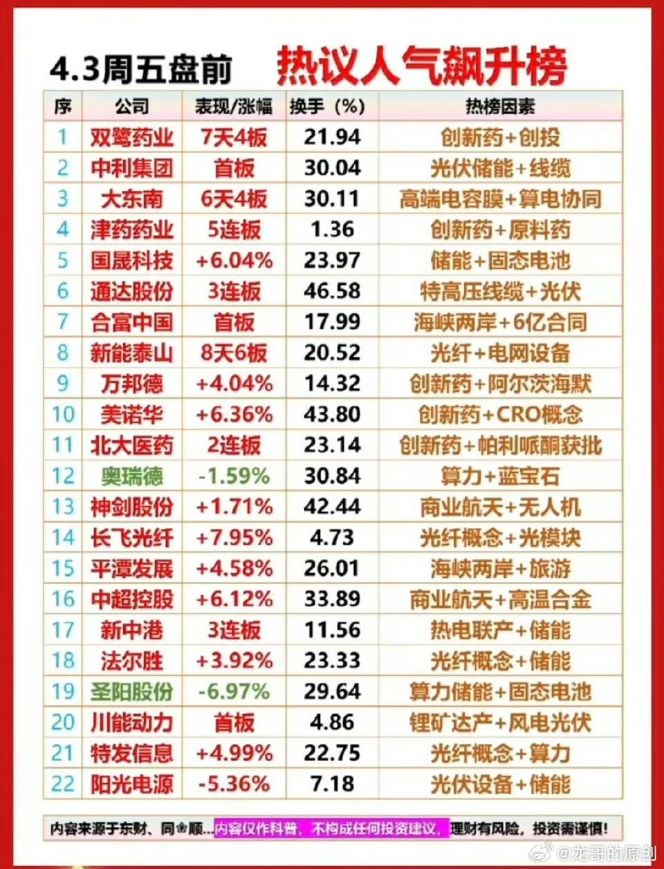 4.3周五 成交活跃个股+人气热搜榜!1.创新药,原料药2.特高压线缆,光伏3