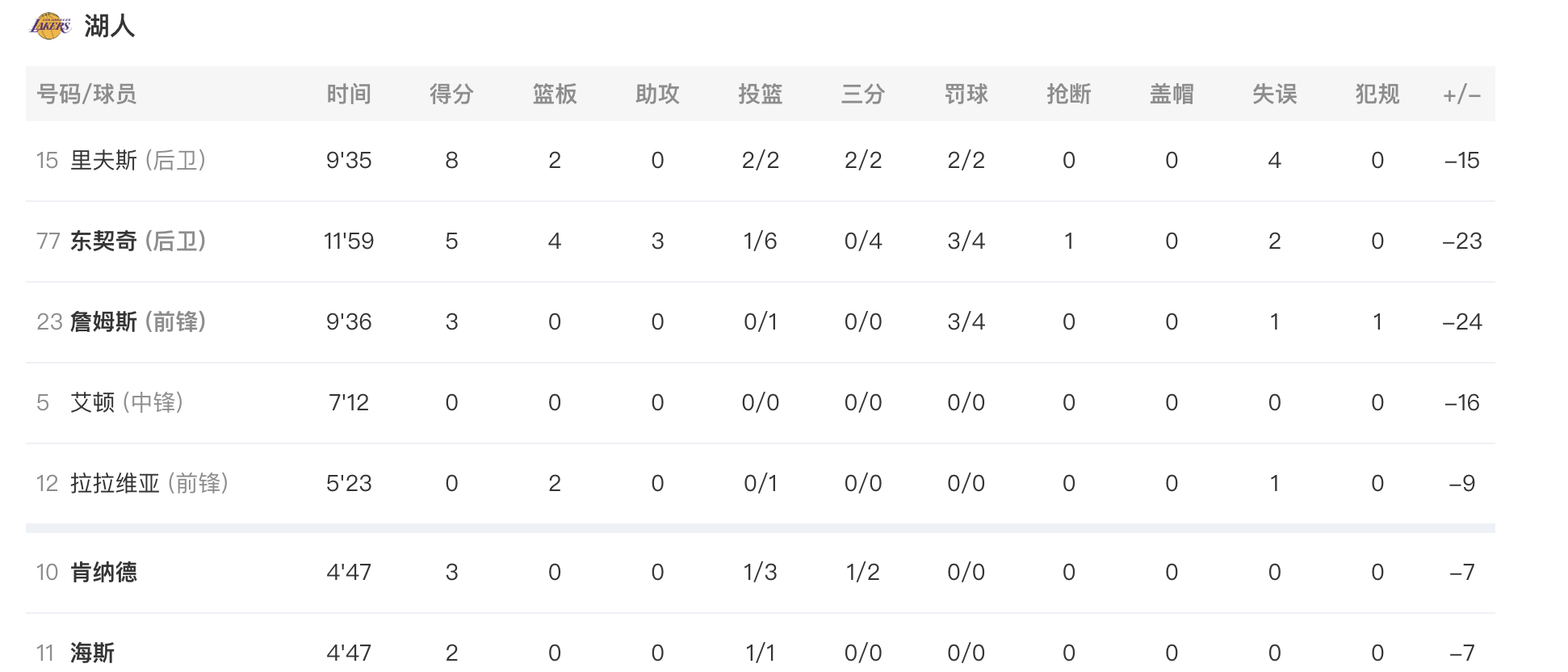 詹姆斯3分,东契奇5分4篮板3助攻,里夫斯8分2篮板4失误,肯纳德3分,海斯2分。