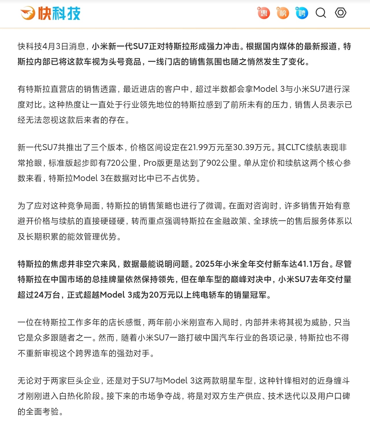 视小米为头号竞争对手,销售人员表示已经无法忽视这款后来者的存在,超过半数都会拿Model 3与小米SU7进行深度对比,一位在特斯拉工作多年的店长感慨,两年前小米刚宣布入局时,内部并未将其视为威胁。