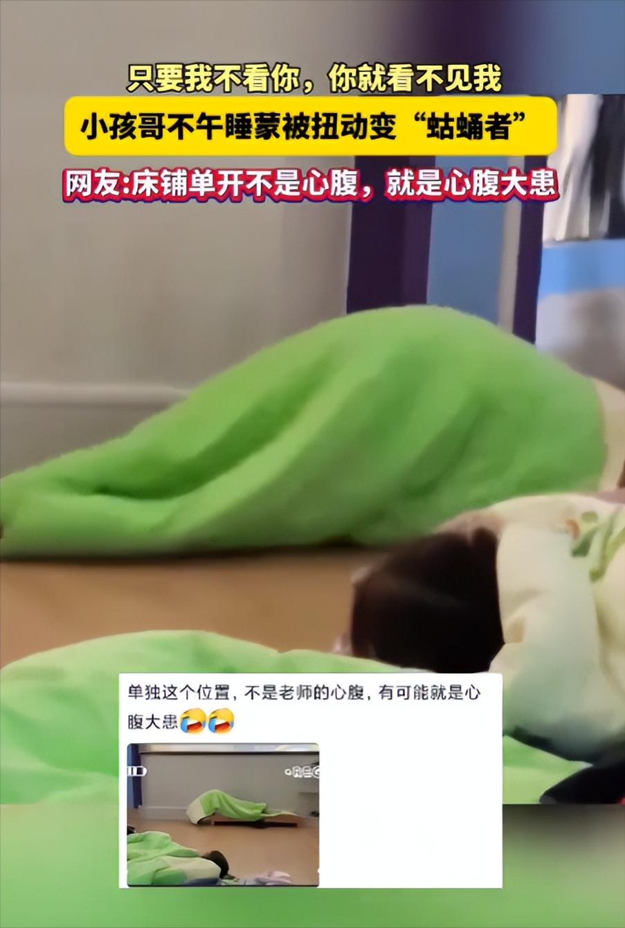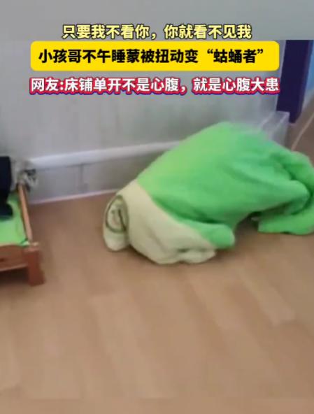 “好一个蛄蛹者”近日,湖北黄冈一所幼儿园的午休时间,一名5岁男童不想午睡,把自己用被裹成了“绿色毛毛虫”,蹑手蹑脚地往床边外“咕涌”,主打一个“只要我裹得严,老师就看不见我”…… 幼儿园里,一个5岁小男孩按捺不住不想午睡的小心思,小心翼翼地拉起绿色被子,把自己从头到脚裹得严严实实,圆滚滚的身子活像一条胖乎乎的“绿色毛毛虫”,小脑袋藏在被子里,连眼睛都不肯露。 做好“伪装”,他屏住呼吸,用胳膊和膝盖轻轻发力,蹑手蹑脚往床边“咕涌”,动作笨拙又谨慎,心里盘算着“只要我裹得严,老师就看不见我”,模样天真又认真。 他以为计划天衣无缝,却不知圆滚滚的身子在小床间格外显眼,每一次轻微“咕涌”,都被不远处的老师看在眼里。 老师没有立刻制止或呵斥,只是静静站着,目光温柔地看着他努力挪动,眼底满是包容。 就在小男孩快要挪到门口时,老师轻轻上前,拍了拍他裹着被子的身子,用温柔的语气示意他回床,没有半句批评指责。 被抓包的小男孩瞬间僵住,过了好一会儿才掀开被子一角,梗着脖子倔强否认,生怕挨批评,模样既可爱又让人心疼。 老师悄悄拍下这一幕发到网上,4月1日这天视频迅速走红,网友们被小男孩圈粉,还创造了“蛄蛹者”一词形容他的动作,热梗很快传遍全网。 网友评论五花八门,有人调侃这是幼儿园版“掩耳盗铃”,有人感慨孩子的纯粹天真,也有家长感同身受,吐槽自家孩子也有过类似调皮举动。 随着视频走红,男孩爸爸曝光了他的日常:平时活泼爱闹,总在沙坑挖通道、用积木搭城堡,精力旺盛,这次“逃跑”并不意外。 很多人觉得他调皮,却不知这种“裹被子就隐身”的想法,藏着儿童成长规律。 就像两三岁孩子玩捉迷藏,常把头藏在窗帘后、屁股露在外面,就觉得躲得很好,这是他们这个年纪的特有思维。 这位老师的处理方式获全网认可,她没有熄灭孩子的童真,也没有强制立规矩,用温柔守住纪律,也保护了孩子的自尊心和好奇心。 据老师介绍,她当时和男孩约定,乖乖午睡就带他看操场的花花草草,男孩听后乖乖回床,很快进入梦乡。 这场好笑的“逃跑计划”,让我们看到孩子的天真,也给家长和老师上了一课:教育从不是简单立规矩、批评指责,而是用温柔守护孩子的天马行空。 这个裹着绿被子的“小毛毛虫”,他的天真倔强,是成长最动人的模样。 愿每个孩子都能在温柔守护下探索世界、保留灵气,愿教育者和家长多一份耐心,看见孩子的需求,用爱陪伴他们慢慢长大。 那些藏在“毛毛虫”被子里的小心思,那些调皮的试探,都是孩子成长最真实的模样,值得我们用心守护。
