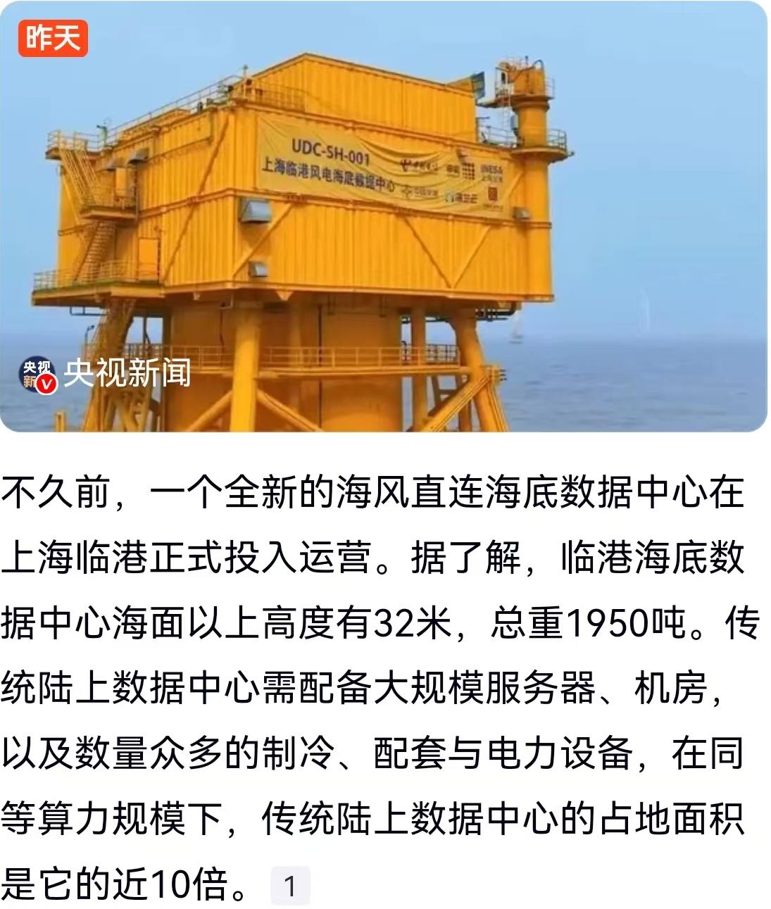 重达1950吨的“巨兽”入海!上海临港搞了个大动作,同等算力省下9成地 见过建在戈壁滩的数据中心,也见过藏在深山溶洞里的“大数据洞窟”,但你见过直接把数据中心“扔”进海里的吗?这不,上海临港最近就干了件新鲜事,一个全新的海风直连海底数据中心刚刚正式投入运营。 这可不是什么小打小闹的实验品,而是一个实打实的“大家伙”。根据目前披露的数据,这座临港海底数据中心在海面以上的高度就有32米,总重更是达到了1950吨。想象一下,这么一个庞然大物矗立在海边,不仅能抗风浪,里面更是装满了算力“大脑”,源源不断地处理着海量数据。 为什么要费这么大劲把数据中心往海里搬?这背后其实是一笔精明的经济账。 我们熟知的传统陆上数据中心,那可是不折不扣的“吞地兽”和“电老虎”。为了安放大规模服务器,得盖大机房;为了让服务器不“中暑”,还得配备数量惊人的制冷设备、配套电力设施。不仅占地面积大,光是散热这一项,就得消耗掉大量的电力资源。 相比之下,海底数据中心的优势就太明显了。这就好比给电脑装了一个天然的“水冷散热器”。同样的算力规模下,传统陆上数据中心的占地面积,竟然是这种海底数据中心的近10倍!对于寸土寸金的一线城市来说,这简直就是在空间上“降维打击”。 不用大规模征地盖楼,利用海水的自然流动就能带走热量,这种“海风直连”的模式,实实在在做到了节能省地又增效。这也难怪前段时间关于“中国把数据中心搬进大海”的话题能冲上热搜,引发包括新浪财经、大象新闻等多家媒体的争相报道。 这次在上海临港投入运营的项目,标志着我国在海底数据中心商业化应用上迈出了坚实一步。它不再是停留在图纸上的概念,而是正在运转的算力引擎。这不仅解决了城市算力需求与土地资源紧张的矛盾,更为未来的数字化基建提供了一个全新的样本。 当我们在手机上流畅刷着视频、玩着游戏时,或许很难想象,这些数据的背后,正有一个重达1950吨的“深海巨兽”在海底默默耕耘。科技改变生活,有时候真的就在我们看不见的地方。 以上内容仅供参考和借鉴