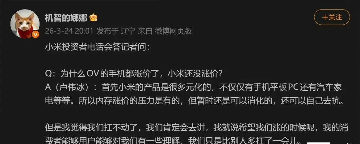 才表扬小米没几天,说好的不涨价,要挺住,愚人节一过,就挺不住了。卢伟冰回应小米宣布涨价,称内存价格涨得离谱。说好的为消费者挺住呢? 4月3日,小米发布公告,受全球存储芯片等关键零部件价格持续大幅飙升影响,经过审慎评估,公司将自2026年4月11日00:00起,调整部分在售产品的建议零售价。 3月24日,卢伟冰还说:小米暂不涨价,靠多元+高端化硬扛。 2026年真的不适合换手机,价格太不理性了。