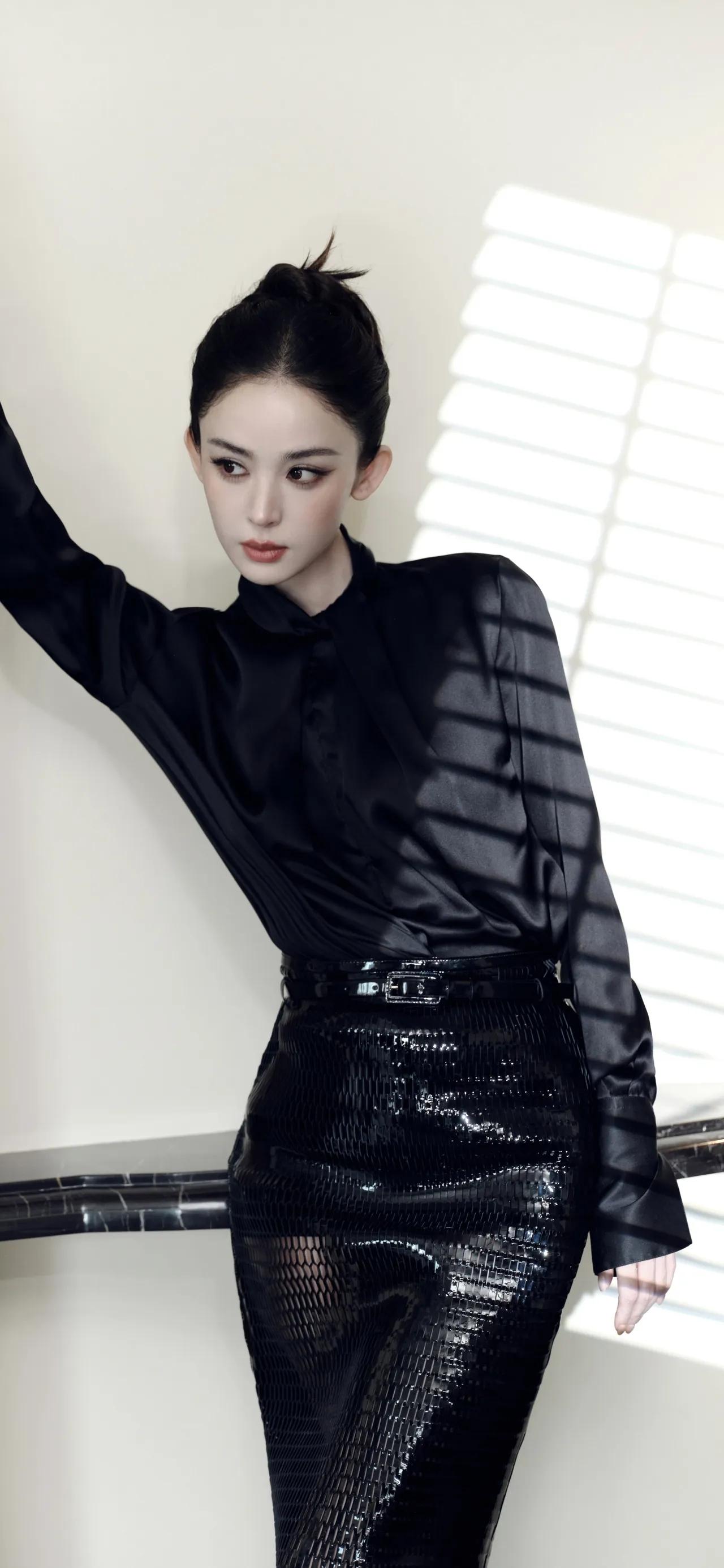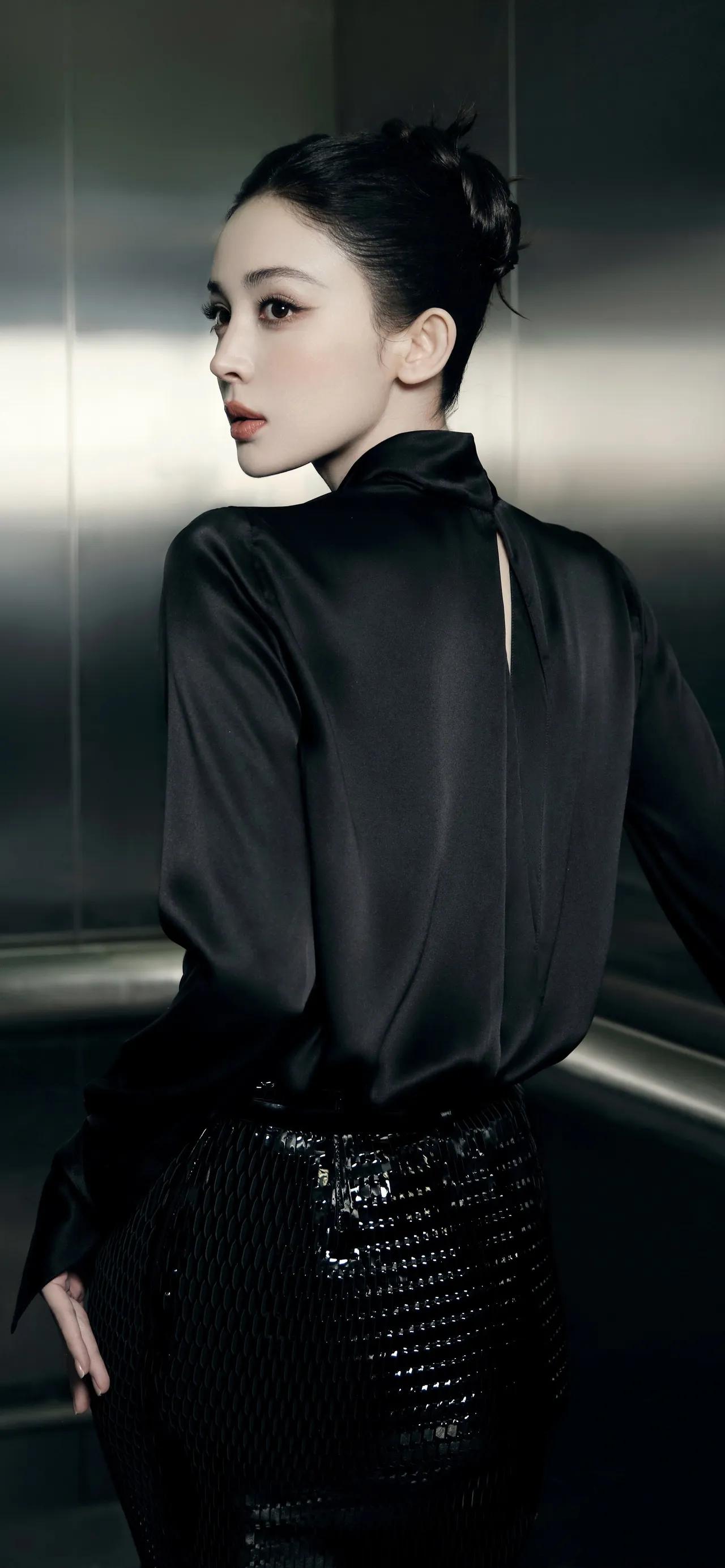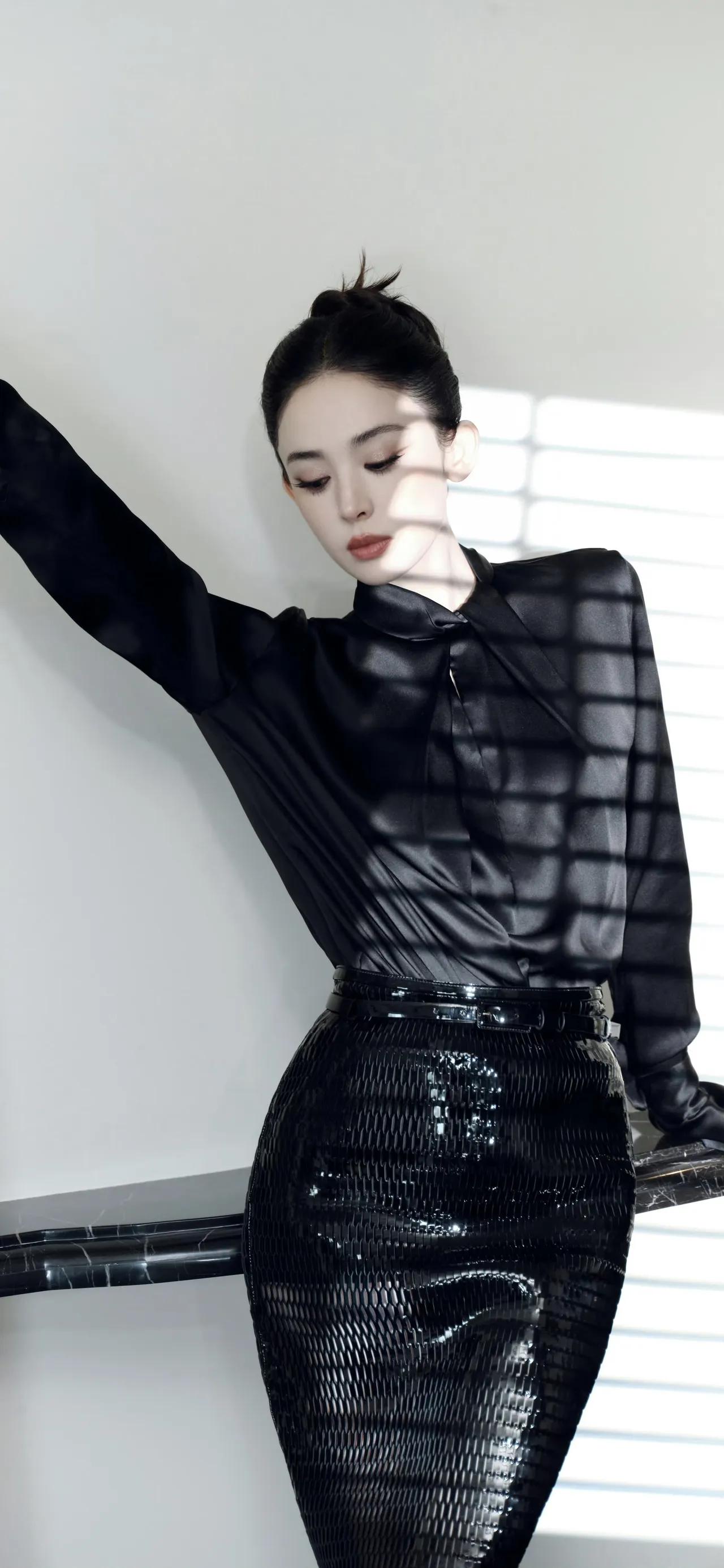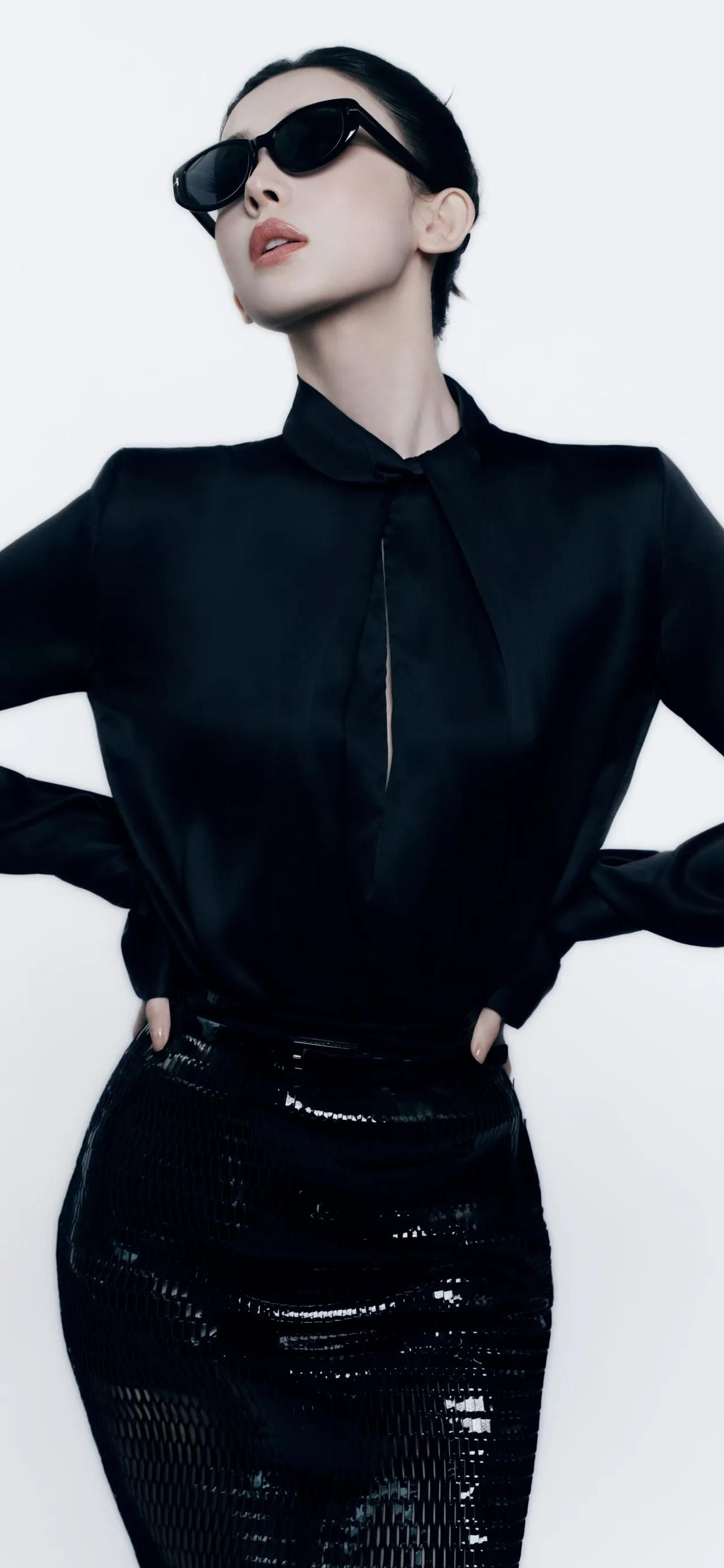 美女壁纸~古力娜扎这组黑调造型太绝了!缎面立领衬衫搭配亮片鱼尾半裙,利落盘发衬出优越肩颈线条,冷感墨镜更添飒爽气场