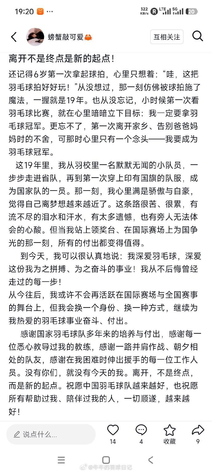 坑姝良官宣退役: 六岁握拍,十九年坚守。 坑姝良从湖南一路打进国家队, 用两届全国冠军赛女双金牌证明了自己。 如今她挥别赛场,却说“换一种身份继续热爱”。 愿这位湘妹子的下一程,依旧有羽球相伴,有光芒相随。 在新的舞台上,续写属于自己的精彩。