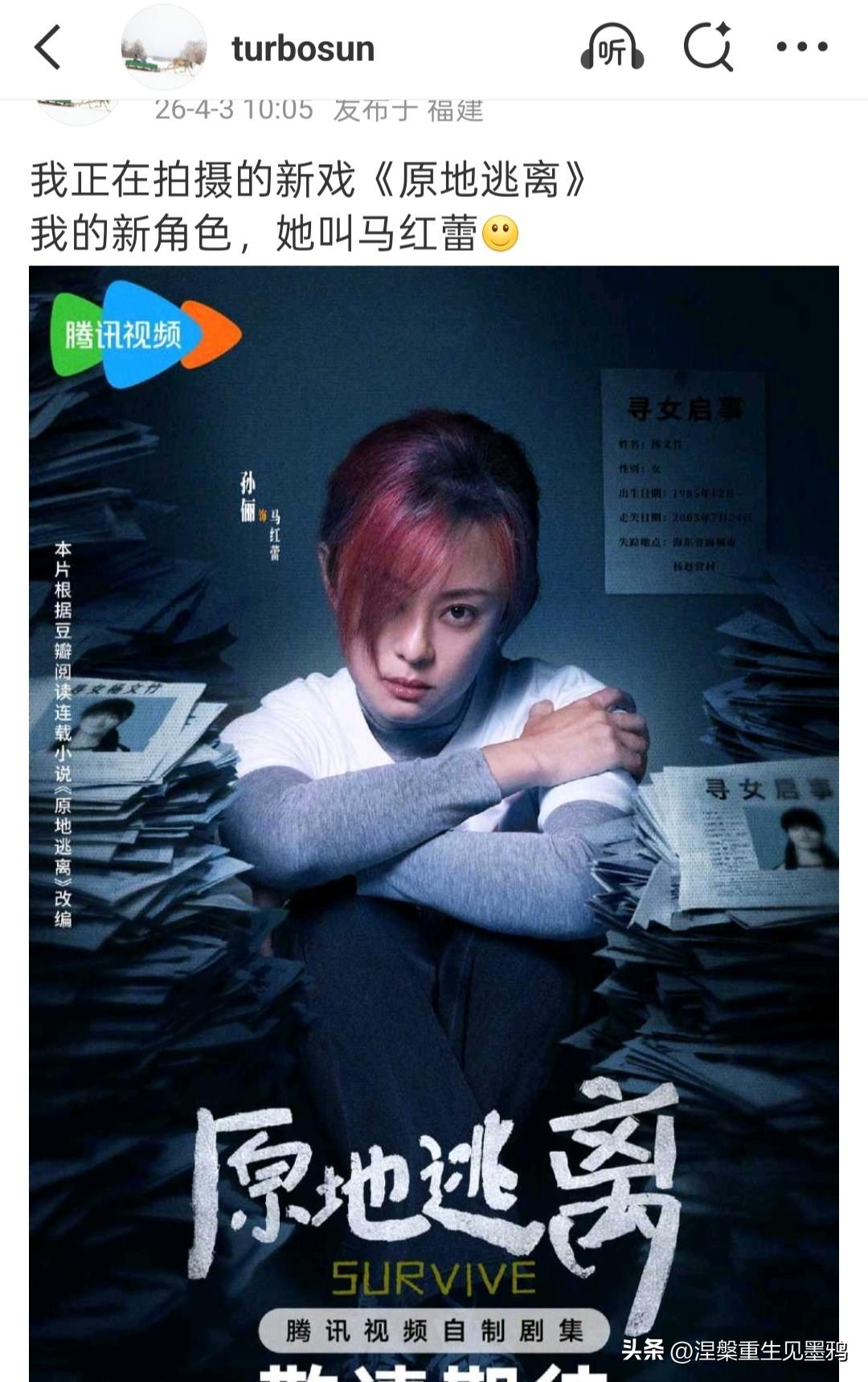 戏约不断步履不停,孙俪开始卷了 最近犯罪悬疑剧《危险关系》热播,荧幕上悬念迭起的精彩故事收获了不少观众的讨论热度,作为演员的孙俪也不忘为新作品帮忙宣传,字里行间尽显对同行作品的支持。 而此刻的孙俪本人,也正扎在剧组马不停蹄地赶拍自己的新作品《原地逃离》。她在社交平台晒出全新角色海报,正式向大家介绍这次的新角色马红蕾:暗红色挑染短发、堆积成山的寻人启事与案件资料,阴郁压抑的海报氛围里,她抱膝直视镜头的眼神带着故事感,一下子就把悬疑氛围拉满,让观众对这个全新角色充满好奇。 从当年凭借《玉观音》走入大众视野,到《甄嬛传》《那年花开月正圆》《安家》《理想之城》留下一个又一个家喻户晓的经典角色,孙俪始终扎根在演员的岗位上,一部接一部作品地打磨手艺。刚一部作品的播出,就扎进下一个新角色的创作里,这样连轴转的工作状态,是孙俪演员生涯的常态,也让大家愈发期待马红蕾这个全新角色,能带给我们怎样的惊喜。