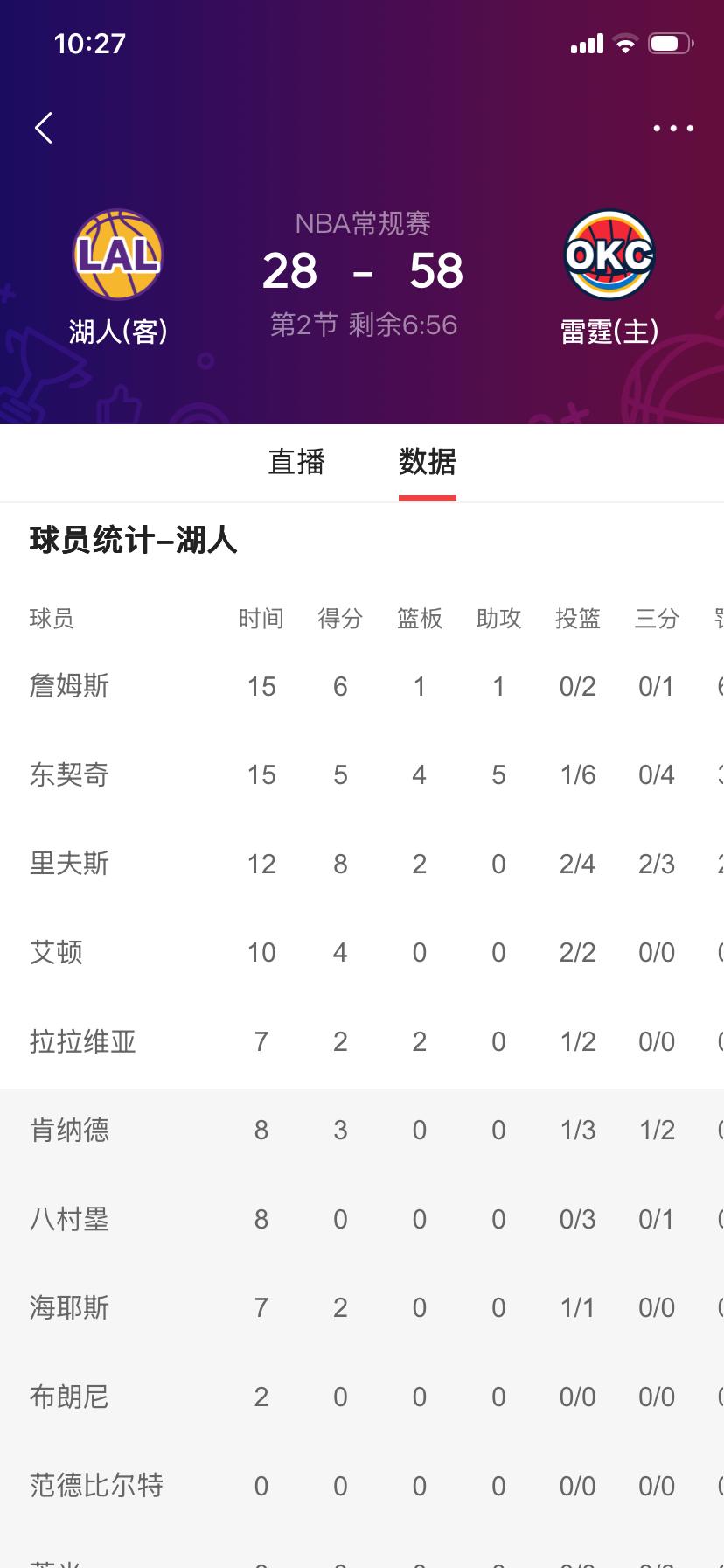 我的妈啊!湖人被雷霆虐成这样,真伪强队? 一节半落后30分,东契奇得分效率一下降,球队进攻直接没法看,全靠他一人不是3巨头吗? 篮板输成这样,投篮数少18次,罚球数多一倍(占一半得分)还能被暴虐…… 现在打弱队是真的稳,遇到强队就露怯了,今年我还以为能争夺总冠军呢。 MVP直面对决输了个底掉,东契奇完全没机会了!
