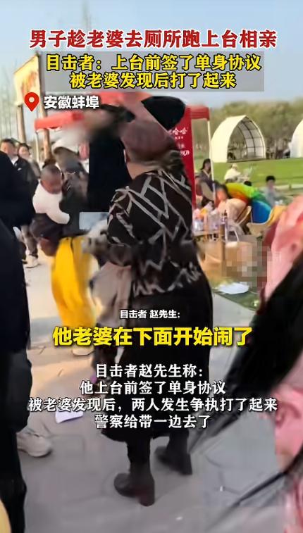 “离了个大谱!” 近日,安徽蚌埠,一男子和老婆去景区玩,没想到男子趁老婆上厕所时,竟上台相亲去了!气氛正热闹时,老婆回来当场拆穿他,没想到男子直接说不想要自己的老婆,等下台后,男子脸都被老婆挠烂!媒婆:老渣男啊! 说起来,这事儿发生在2026年4月2日下午,地点就在安徽蚌埠固镇的樱花园,当时那里正在举办相亲大会,现场来了不少单身男女,大家都是抱着找对象的心思来的,氛围一直挺热闹。 没人能想到,会有一个已经有老婆的男人,混在里面凑热闹,还真的上台参与相亲,甚至做得比真正的单身人士还认真。 这个男子今年51岁,姓刘,当天是和妻子一起去樱花园玩的,本来两人一起逛景区,没什么异常。 可就在他妻子起身去洗手间的短短几分钟里,他像是抓住了难得的机会,毫不犹豫地冲上了相亲台。 他可不是上去随便看看,而是有备而来,当场就签下了一份单身承诺书,还在台上侃侃而谈,编造自己的经历,说自己2012年就离婚了,一个人在上海打工,还带着一儿一女,把自己塑造成了一个辛苦又靠谱的单身男人形象。 他这套说辞还真的骗到了人,台上有一位女嘉宾很快就对他产生了兴趣,没过多久,另一位女嘉宾也看上了他,现场一下子就变成了“二女争一男”的场面。 刘某见状,更是飘了起来,还跟主持人说想同时认识两位女士,那副左右逢源的样子,仿佛真的把自己当成了香饽饽,完全忘了自己是有老婆的人,也忘了老婆只是去上了个厕所,很快就会回来。 他沉浸在这种虚假的热闹里,却没发现,危险已经悄悄靠近。当时现场的工作人员察觉到不对劲,赶紧冲上台给媒婆递信,说台下有位女士声称台上的男子是她老公。 话音刚落,刘某的妻子就从洗手间出来了,一眼就看到了台上笑得一脸得意的丈夫,瞬间就崩溃了。 她快步冲到台前,当着所有围观群众的面,把事情的真相一五一十地说了出来,当场拆穿了丈夫的谎言。 原本热闹的现场,瞬间就安静了下来,空气都仿佛凝固了,围观的人都惊呆了,没人想到会发生这样的事。 面对老婆的拆穿,刘某没有丝毫的不好意思,也没有道歉,反而摆出一副破罐子破摔的样子,当着全场人的面大喊,说自己就是不想要老婆了,不想跟她继续过了,甚至还否认两人的婚姻关系,态度十分嚣张。 现场的媒婆,也就是大家说的王婆,看到这一幕气得不行,拿起话筒就怒斥刘某是“老渣男”。 她说自己做这行这么多年,什么样的人都见过,头一回碰到这种已婚还冒充单身上台相亲的,刘某签下的单身承诺书,也成了一张废纸。 刘某从台上下来之后,他妻子积压的怒火彻底爆发了,冲上去就跟他理论,情绪激动之下,直接动手把他的脸挠得稀烂,满脸都是伤痕。 围观的群众赶紧上前把两人拉开,还有人担心事情闹大,拨打了报警电话,最后警察赶到现场,把两人带走进行调解。 后来大家才知道,这对夫妻其实早就领了离婚证,但一直还住在一起,以夫妻的名义生活。 刘某之所以会趁老婆上厕所去相亲,说白了就是不珍惜彼此的感情,拿着老婆的信任肆意糟蹋自己。 这场闹剧不仅让刘某丢尽了脸面,也差点骗了两位无辜的女嘉宾,更是践踏了最基本的道德底线。 不管有没有离婚证,只要还以夫妻名义相处,就该守住起码的尊重和忠诚,趁着伴侣离开几分钟就去相亲,这种行为真的太让人不齿了。