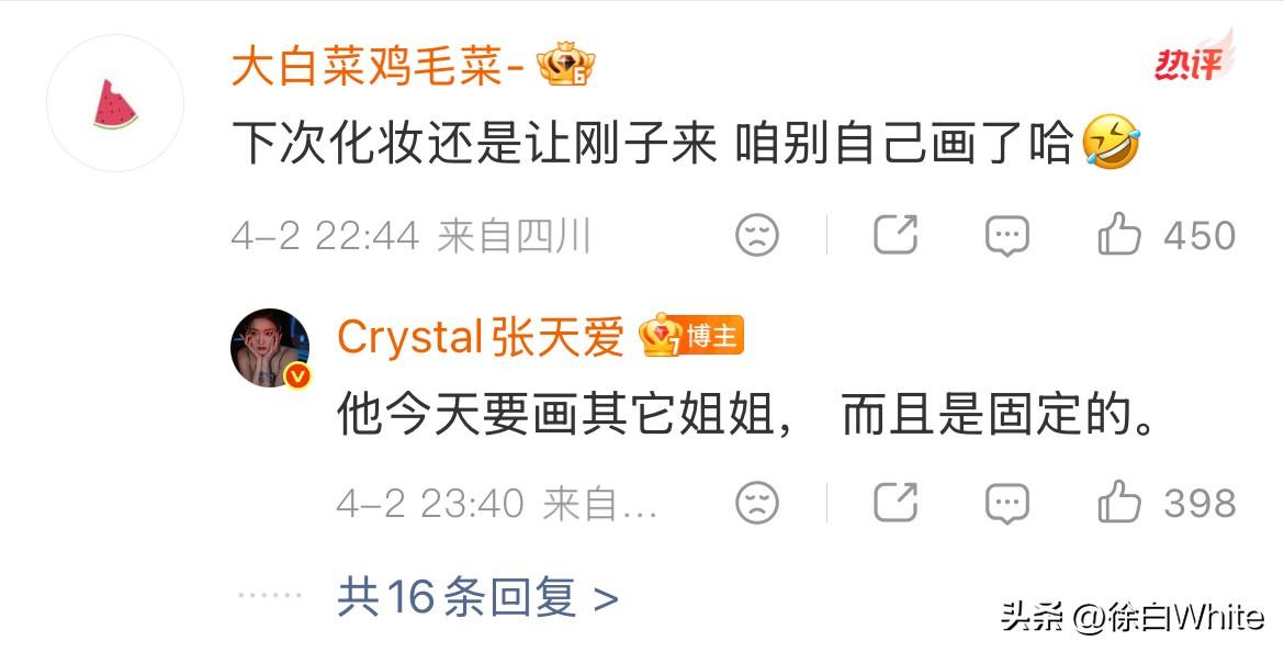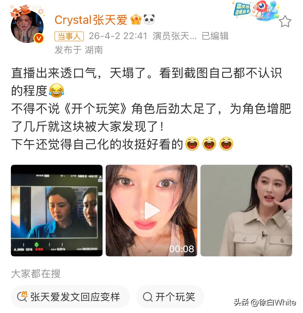 4月3日,张天爱回应变脸问题,否认动脸,直言看到热搜图的那一刻,天塌了! 浪姐镜头里的自己,她本人都不认识,随即张天爱作出解释并配图澄清,说是因为拍戏增重的原因改变了面相,另外还有一点,化妆师负责其他艺人,她自己化的妆…… 增重跟化妆真的能对一个人眉眼面相产生如此大的改变么?对于这点,还是一个大问号! 不过既然张天爱本人都这么说了,大部分网友又表示不太记得她的长相了,那不如就重新认识一次,这一季的浪姐吐槽声一片,张天爱因为脸的事获得了很高的关注度,也算是件好事,其实有热度!