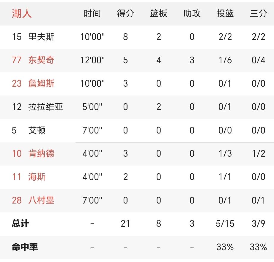 东契奇又开启了三分模式。 具体的说,是在对阵雷霆第一节的时候就开启了浪投三分模式。 湖人投篮不中,雷霆抢下一个个防守篮板,然后一次次反击成功。 第一节结束,东契奇6投1中,三分4中0,只得5分,湖人21:44落后23分。 是不是今天的比赛就等于是结束了? 是不是后面三节比赛都是垃圾时间啦?