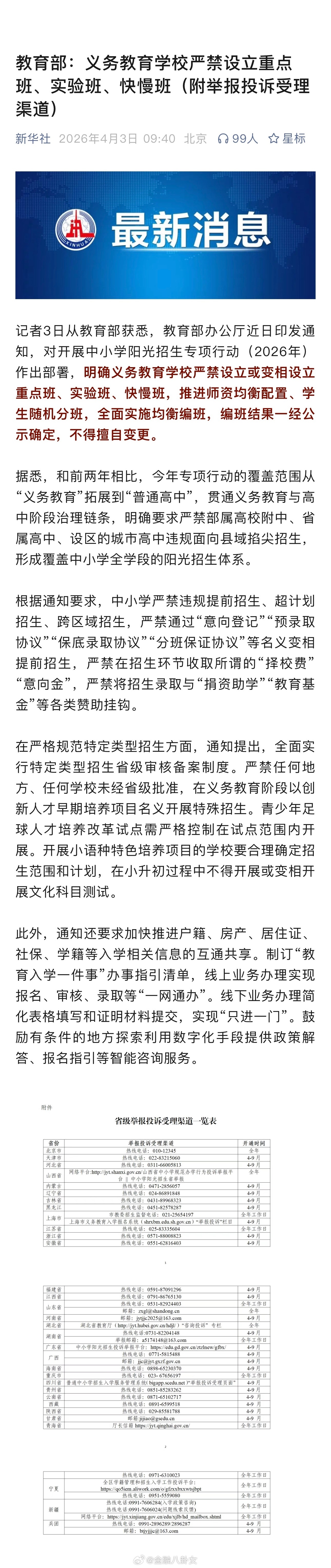 教育部:义务教育学校严禁设立重点班、实验班、快慢班(附举报投诉受理渠道)小学初中严禁设重点班实验班