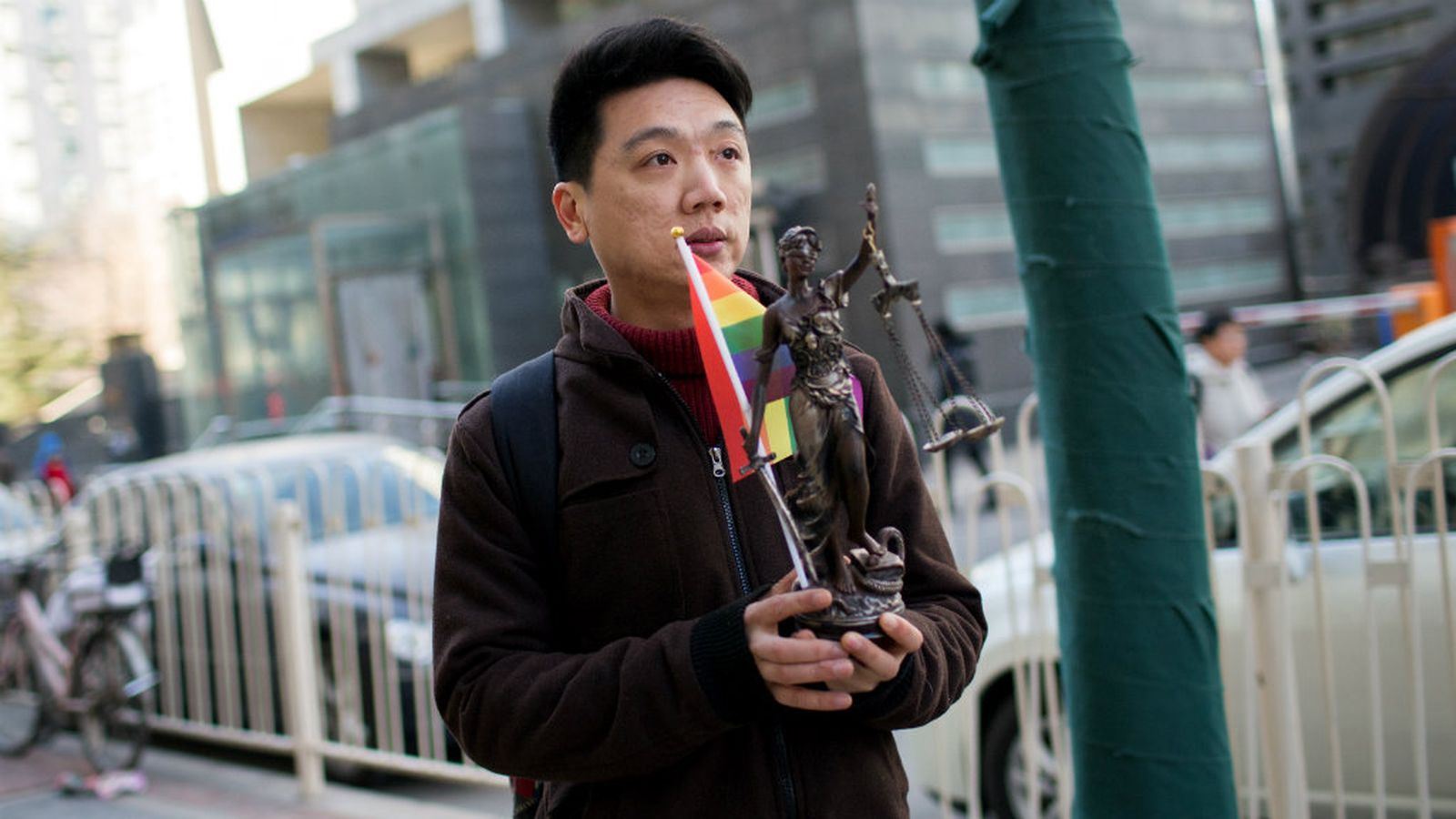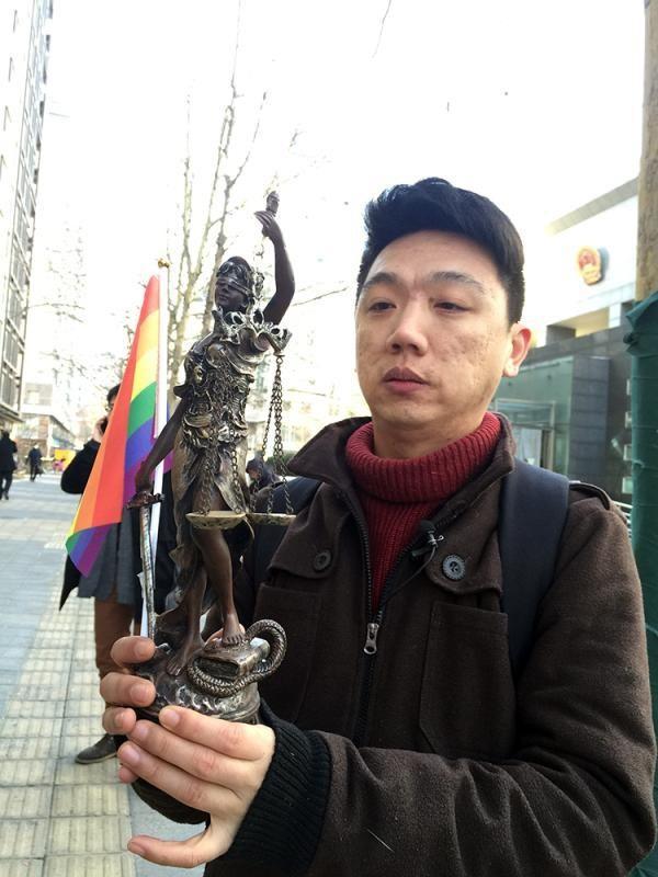 图1-图2:2014年7月开庭时,支持小振的朋友在法院门口向路人普及“同性恋不需要被治疗”。图3-图6:胜诉后,小振向记者展示正义女神雕像、彩虹旗和判决书