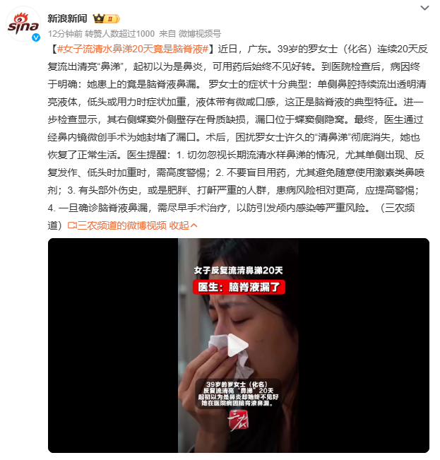 女子流清水鼻涕20天竟是脑脊液广东39岁女子流清水鼻涕20天确诊脑脊液鼻漏,自发性病例多因颅底骨质缺损,肥胖、打鼾人群风险更高。医生强调:别让“以为是鼻炎”成为延误治疗的借口,及时检查才能保命!社会需提升对罕见病的认知,避免“英雄流血、家人流泪”式悲剧。
