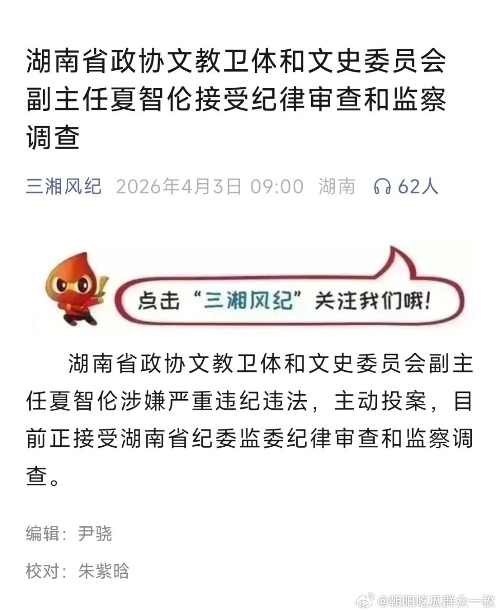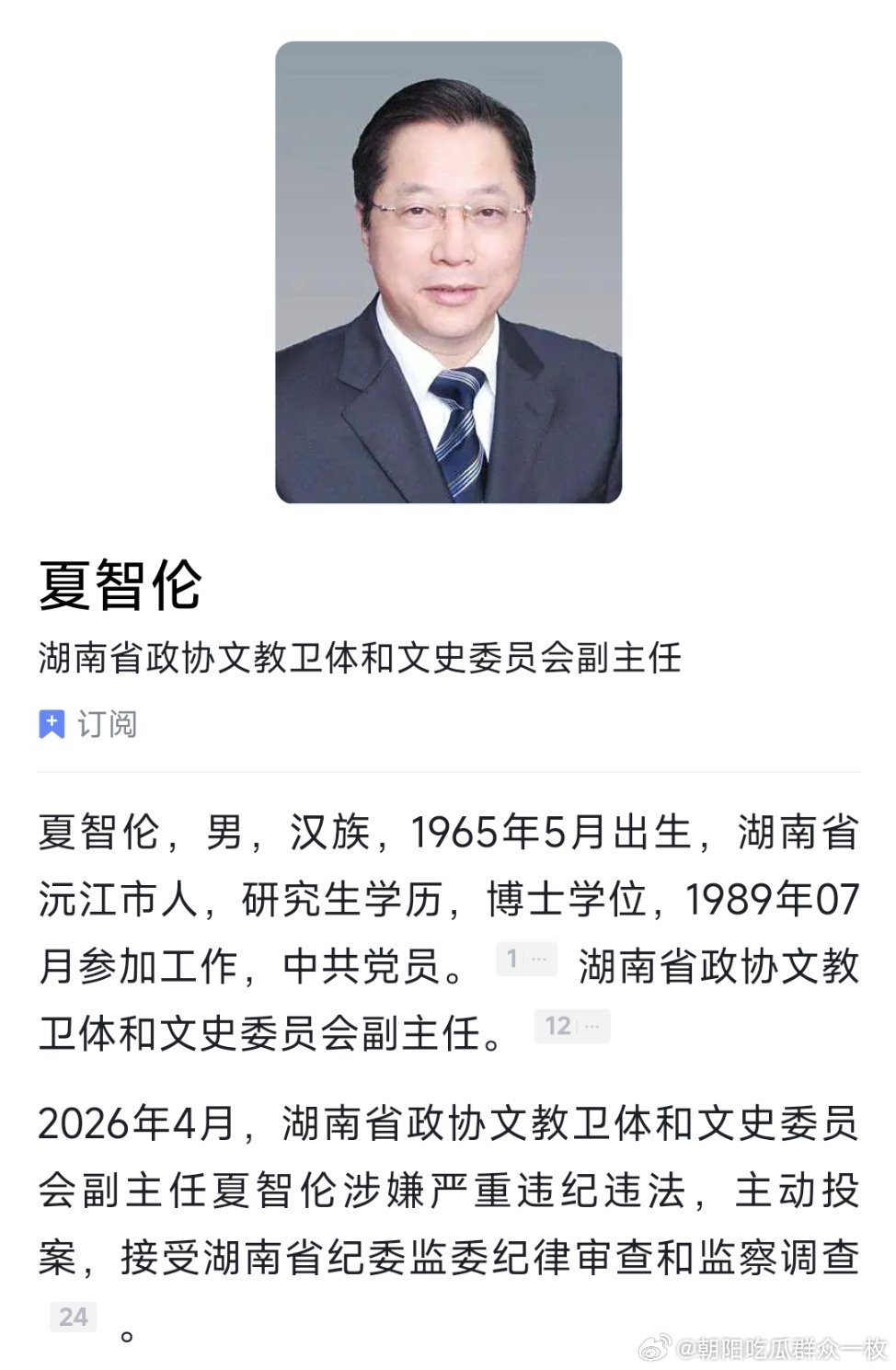 湖南省政协文教卫体和文史委员会副主任夏智伦接受纪律审查和监察调查,曾任湖南省教育厅厅长。