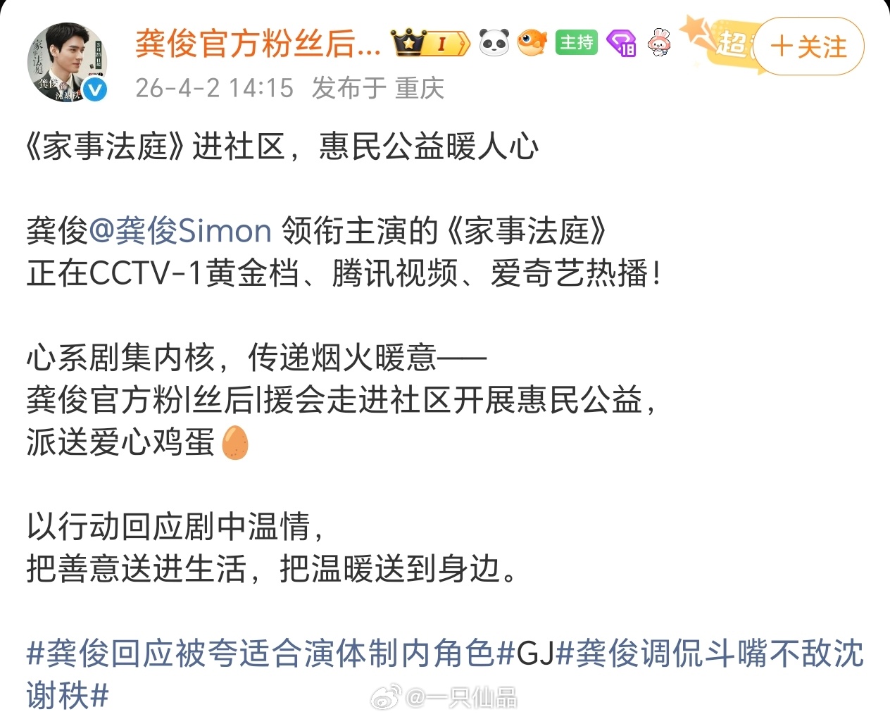 龚俊粉丝太棒了,充满正能量,做的永远比说的多《家事法庭》惠民公益活动,走进社区开展派送爱心鸡蛋🥚,把善意送进生活,把温暖送到身边家事法庭