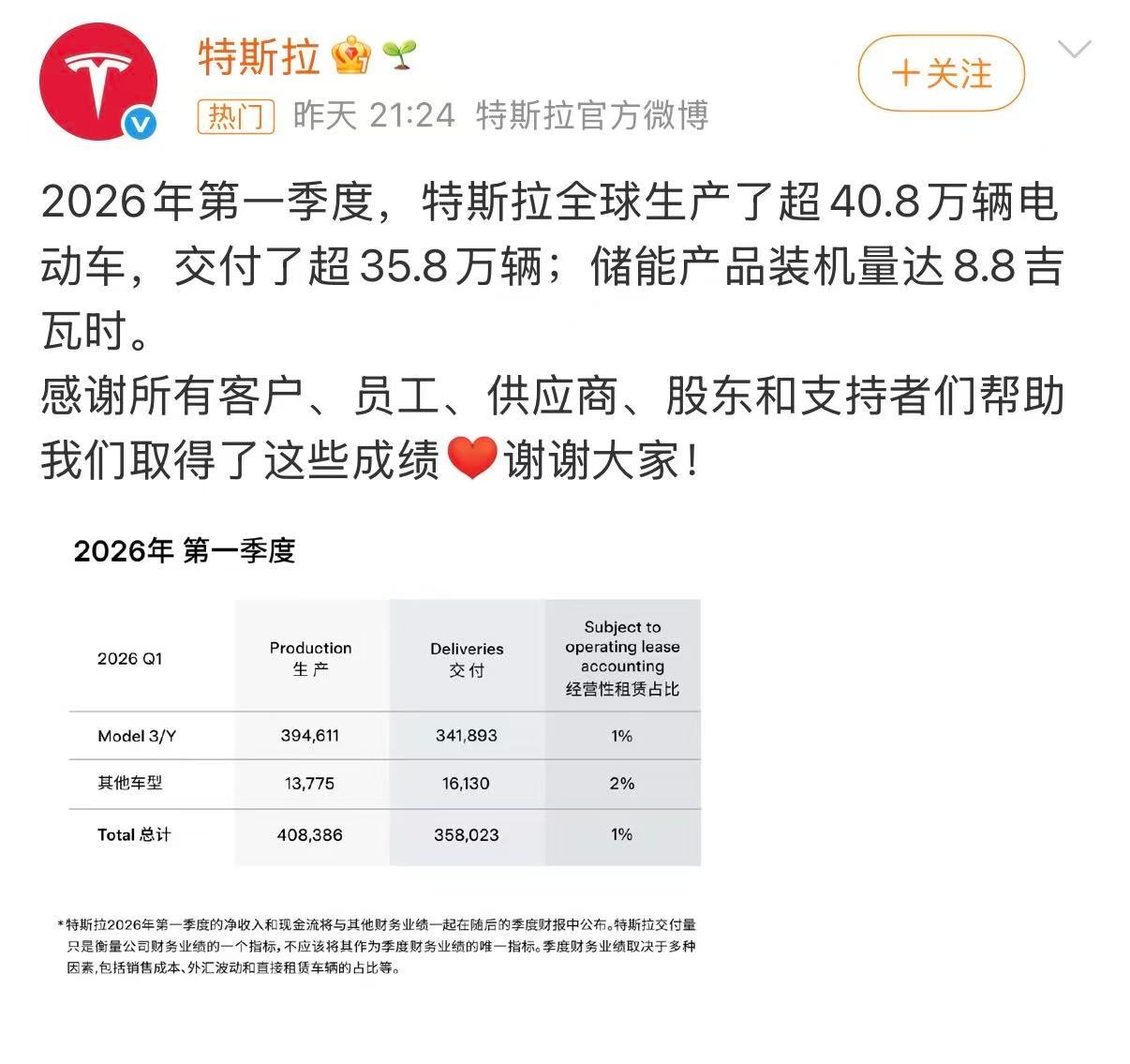 特斯拉再度产销失衡特斯拉一季度产销失衡,产量比销量多5万辆、库存创新高。核心还是交付不及预期,加上产量大幅高于销量,导致库存上升,生产40.8万辆,比交付多出约5万辆,库存天数升至35天(历史高位)。另外,储能部署仅8.8GWh,低于市场预期的14.2 GWh,比预期低约39%,作为高利润业务,直接拖累EPS。特斯拉一季度库存车数量创新高