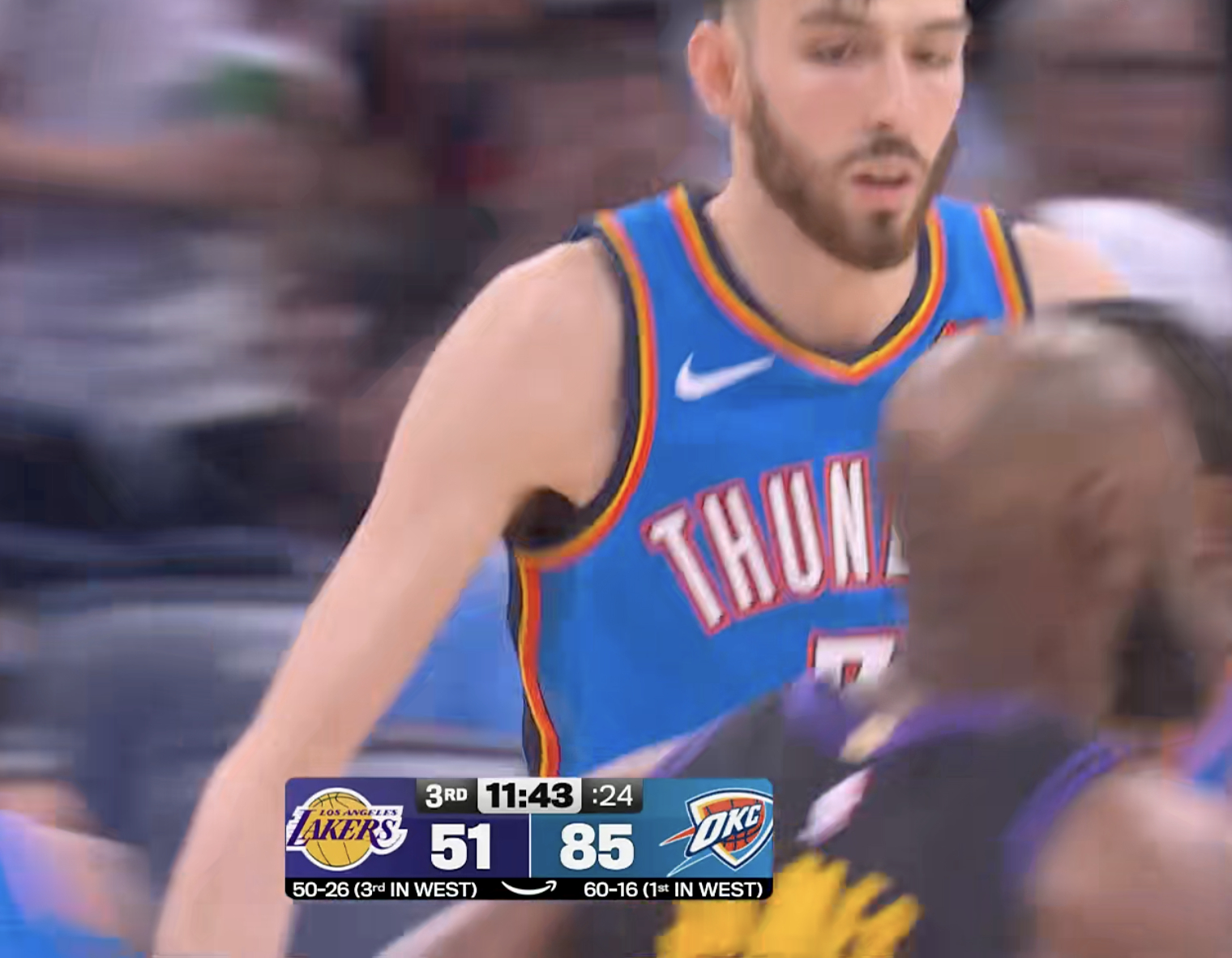 难得追,第三节开始,雷霆率先进三分了,湖人落后34分。湖人vs雷霆