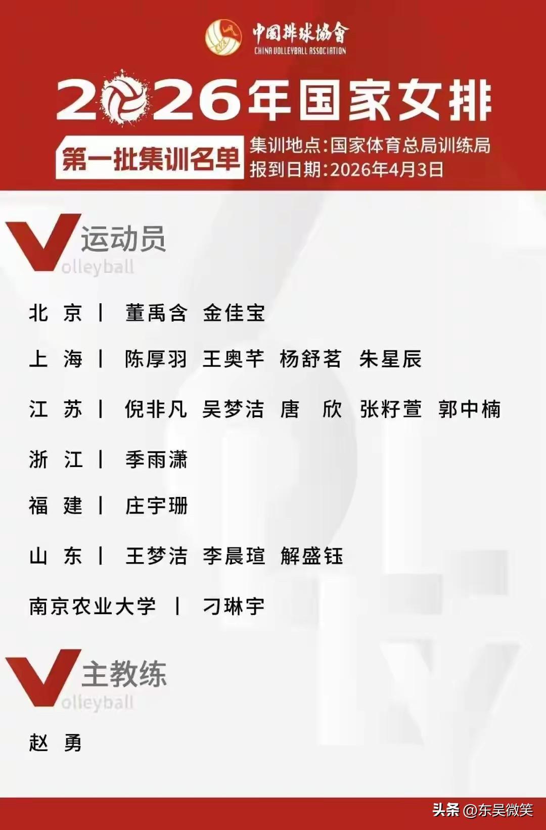 中国排协公布了中国女排2026首批集训名单,江苏、上海是最大赢家,李盈莹、朱婷未出现在名单当中。 女排主教练赵勇表示,队伍组建考虑了今年比赛任务和球队长远发展,采用了老中青相结合的方式。 对于部分名将未在名单中,赵勇说,这只是首批名单,在国外联赛征战的球员赛季还没结束,队里会综合考虑,关于李盈莹,赵勇表示,她在天津做康复训练,我们时刻关注着她并保持联系。 赵勇说,今年的目标是争取拿到亚锦赛冠军,以便第一时间取得奥运会入场券。