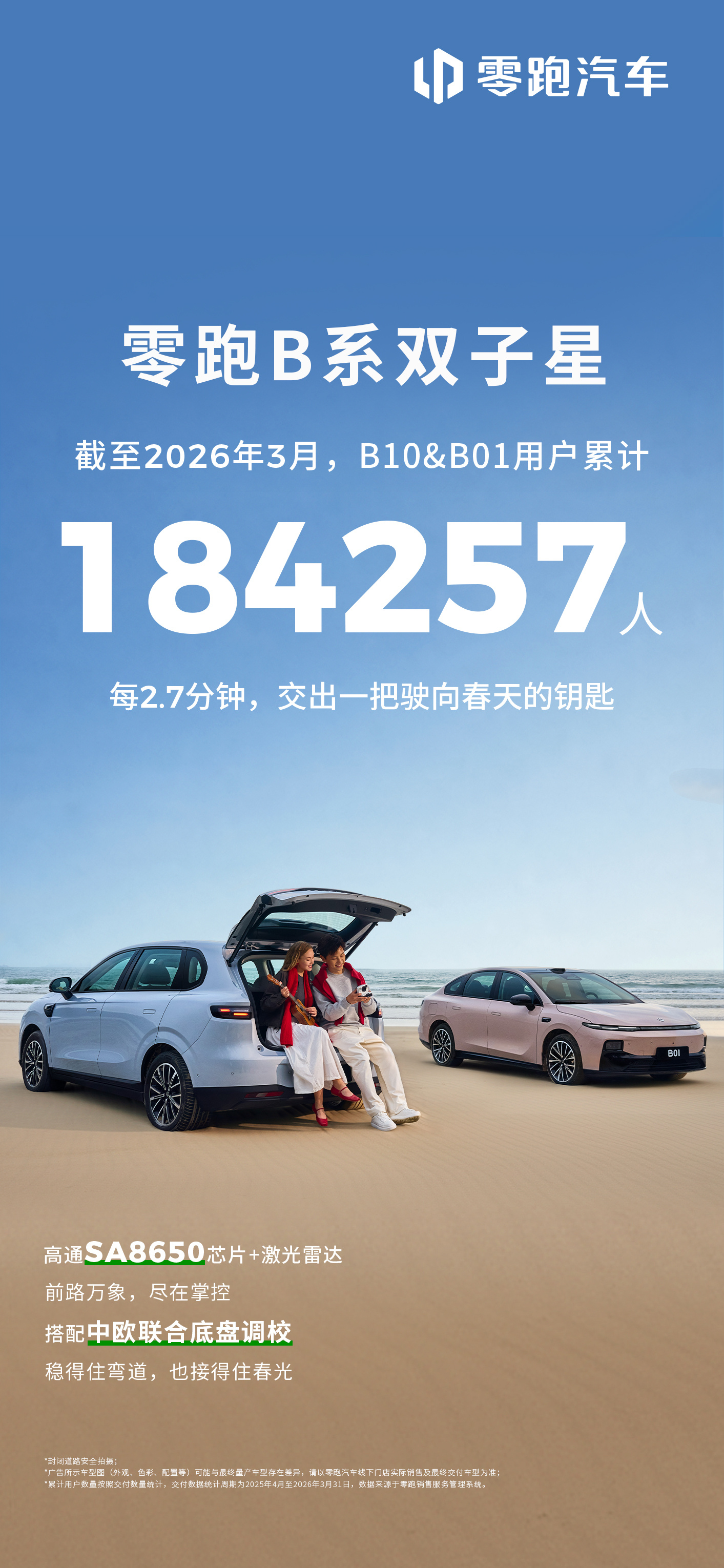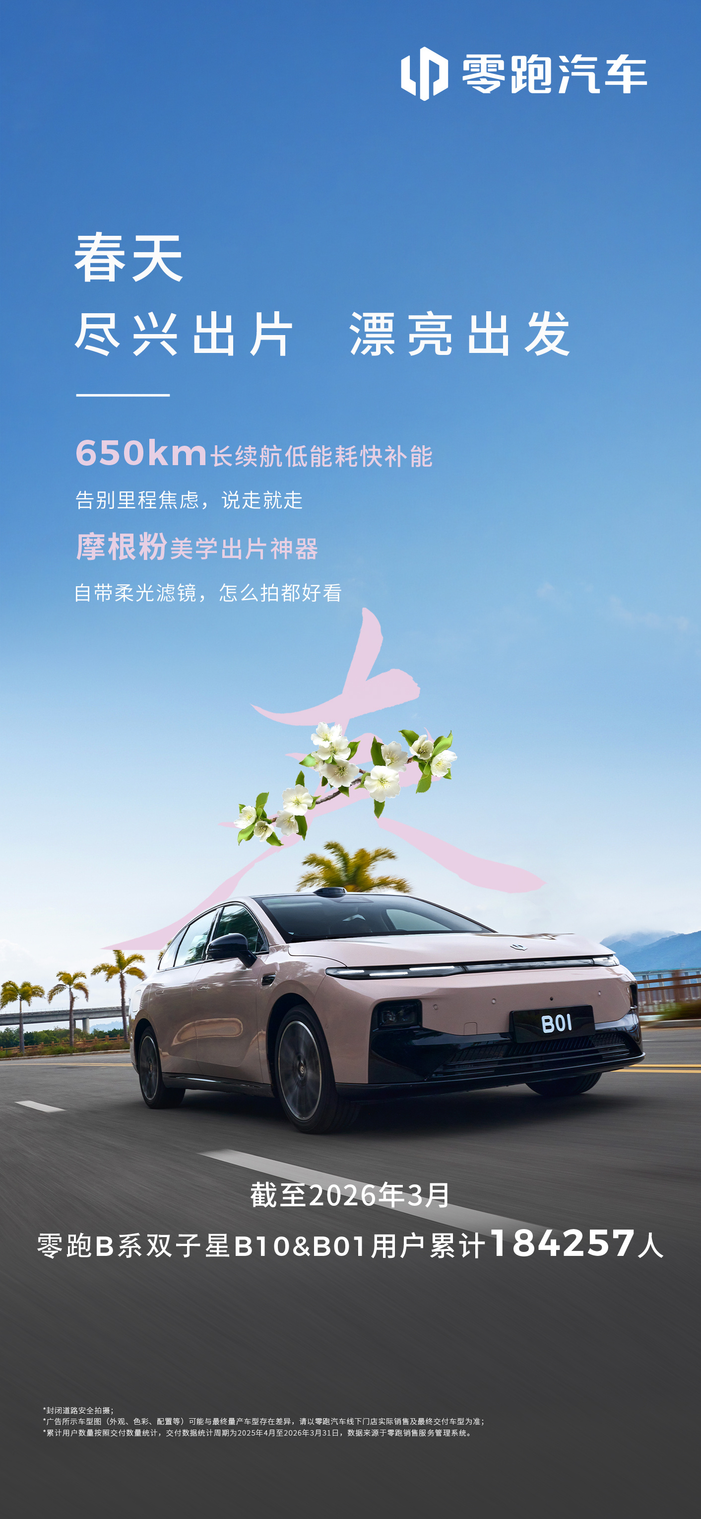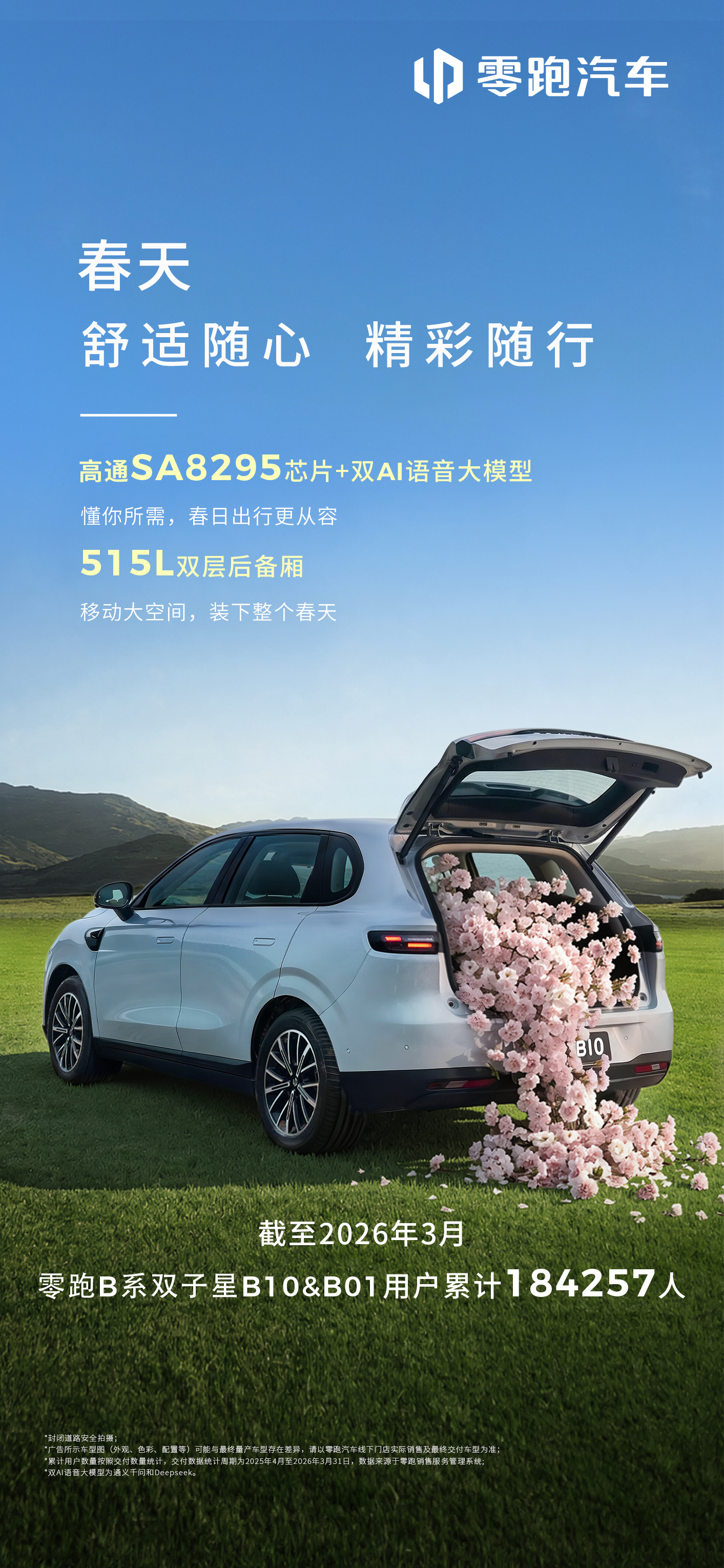 出门踏青,零跑相伴🌸零跑B系双子星B01&B10用户累计超184,257人每2.7分钟,交出一把驶向春天的钥匙✔️搭载激光雷达,多种路况从容应对✔️SA8295芯片,丝滑反应不卡顿✔️双AI语音大模型,懂得多更谈得来✔️中欧联合底盘调校,稳得住弯道,接得住春光让每一次出发,都轻松又尽兴✨零跑B01零跑B10