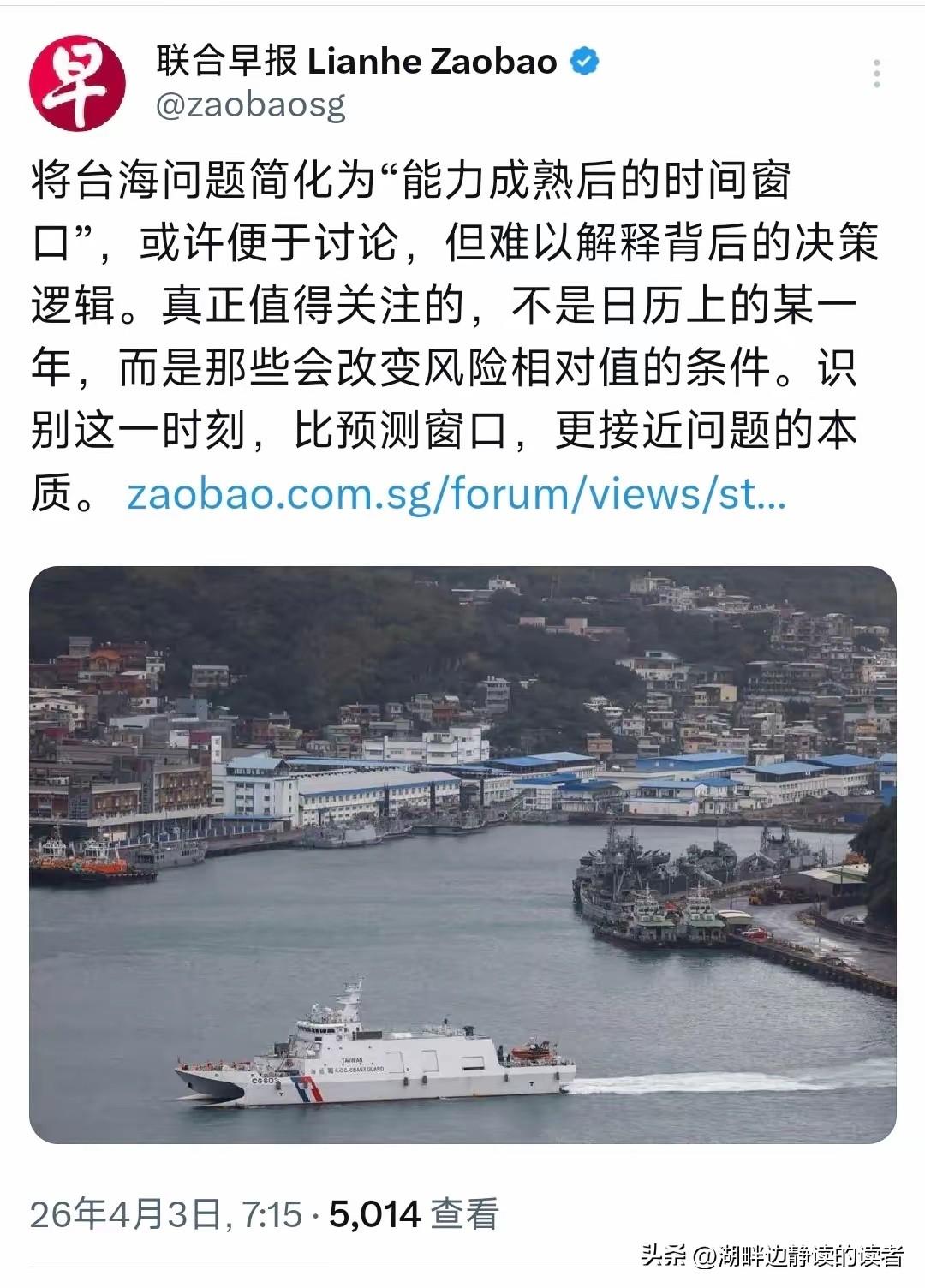 新加坡联合早报今天(4月3日)发表姚占新的评论称:“将台海问题简化为‘能力成熟后的时间窗口’,或许便于讨论,但难以解释背后的决策逻辑。真正值得关注的,不是日历上的某一年,而是那些会改变风险相对值的条件。识别这一时刻,比预测窗口,更接近问题的本质。” 西方智库与美国军方长期炒作2027、2035等所谓统一时间表,本质是为对台军售与亚太驻军制造借口,刻意忽略台海问题的核心是主权与法理。 台湾问题属于中国内政,任何外部势力无权设定时间节点,决策逻辑始终围绕捍卫国家主权、遏制“台独”分裂、维护两岸同胞根本利益展开。 法理“台独”的推进程度是首要风险变量,民进党当局一旦触碰红线,无论处于哪一年,都会触发捍卫国家领土完整的必要行动。 美国及盟友军事介入的强度直接改写风险对比,美军舰机常态化抵近、对台大规模军售,都会让台海和平稳定的风险阈值快速抬升。 两岸军事力量对比持续向大陆倾斜,解放军海空力量与区域拒止能力不断强化,压缩外部势力干涉空间,改变冲突成本的相对关系。 岛内民意与“去中国化”教育持续发酵,年轻世代国家认同淡化,长期积累会提升统一的社会成本,成为影响风险判断的重要内因。 全球供应链与半导体格局变动影响外部干涉意愿,台湾芯片产业对美欧的依赖度变化,会直接左右西方国家的台海政策选择。 中美战略稳定框架的松紧程度决定风险烈度,高层沟通渠道畅通可降低误判,对抗升级则会让台海成为大国博弈的前沿火药桶。 国际社会一个中国原则的巩固程度,联合国及多数国家坚守公约,挤压“台独”国际空间,降低分裂行径的外部支撑力。 大陆综合国力与海外利益拓展,让应对外部制裁与围堵的韧性增强,风险承受能力提升,改变战略决策的成本收益计算。 单纯锁定年份的预测流于表面,忽视动态变量容易造成战略误判,西方舆论炒作时间表本质是干扰中国发展节奏的舆论战。 国家统一进程不以西方设定的日历为转移,核心在于风险条件的质变,而非固定时间节点的机械等待。 大陆始终坚持和平统一方针,尽最大努力维护两岸和平,只有在“台独”分裂与外部干涉突破底线时,才会采取断然措施。 识别风险临界点、把握战略主动权,远比猜测年份更具现实意义,这也是看透台海局势本质的关键所在。看台海动态 台海新规则 台海缓冲区 每日台海 麻烦看官老爷们右上角点击一下“关注”,既方便您进行讨论和分享,又能给您带来不一样的参与感,感谢您的支持! 各位读者你们怎么看?欢迎在评论区讨论。