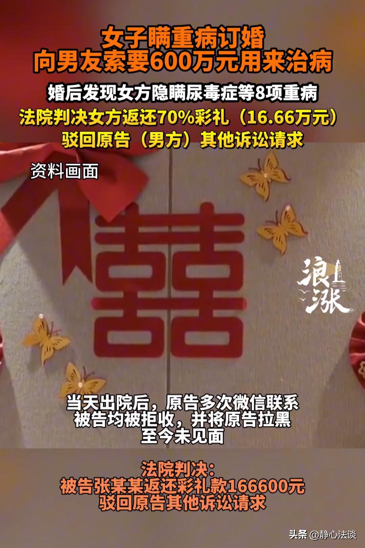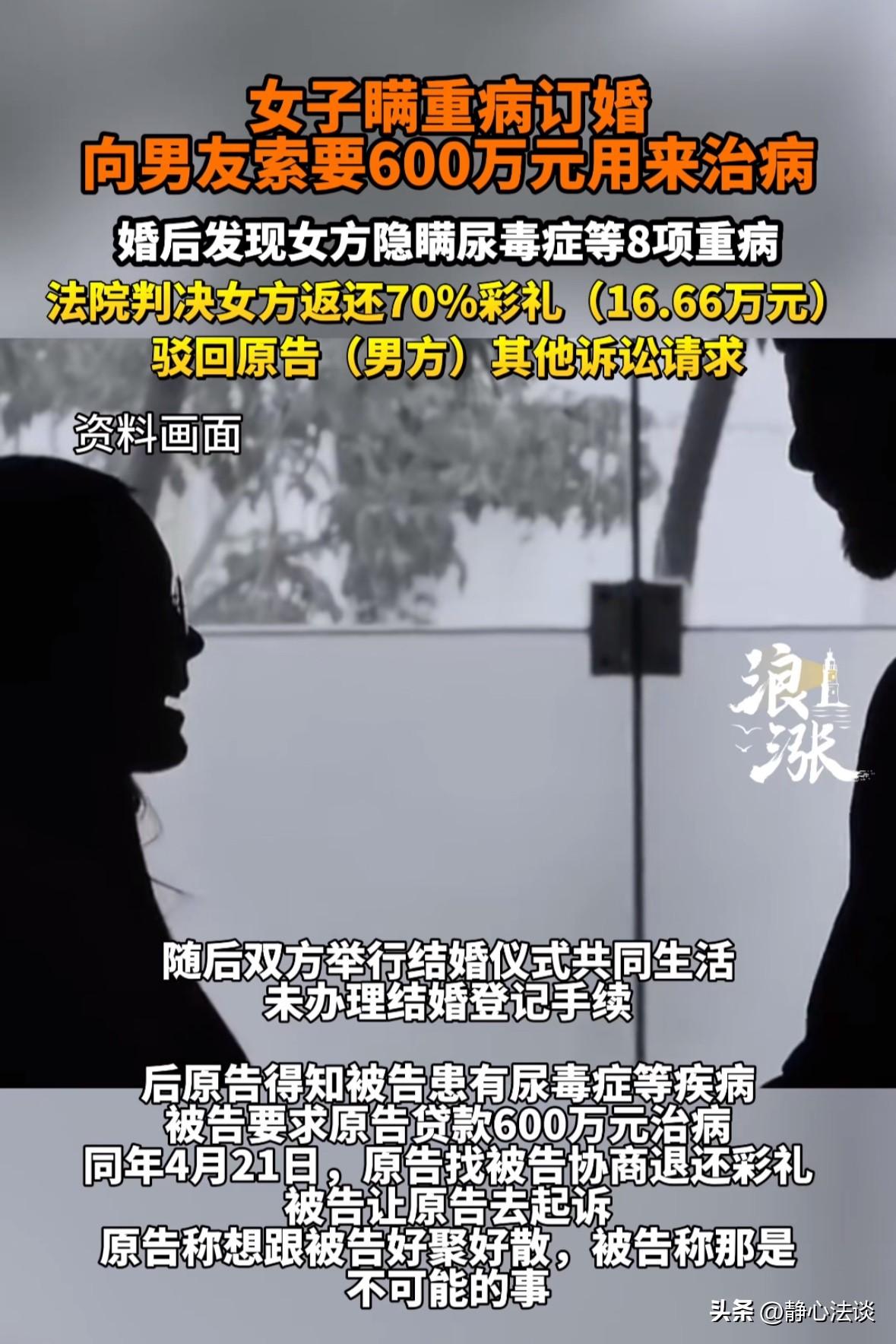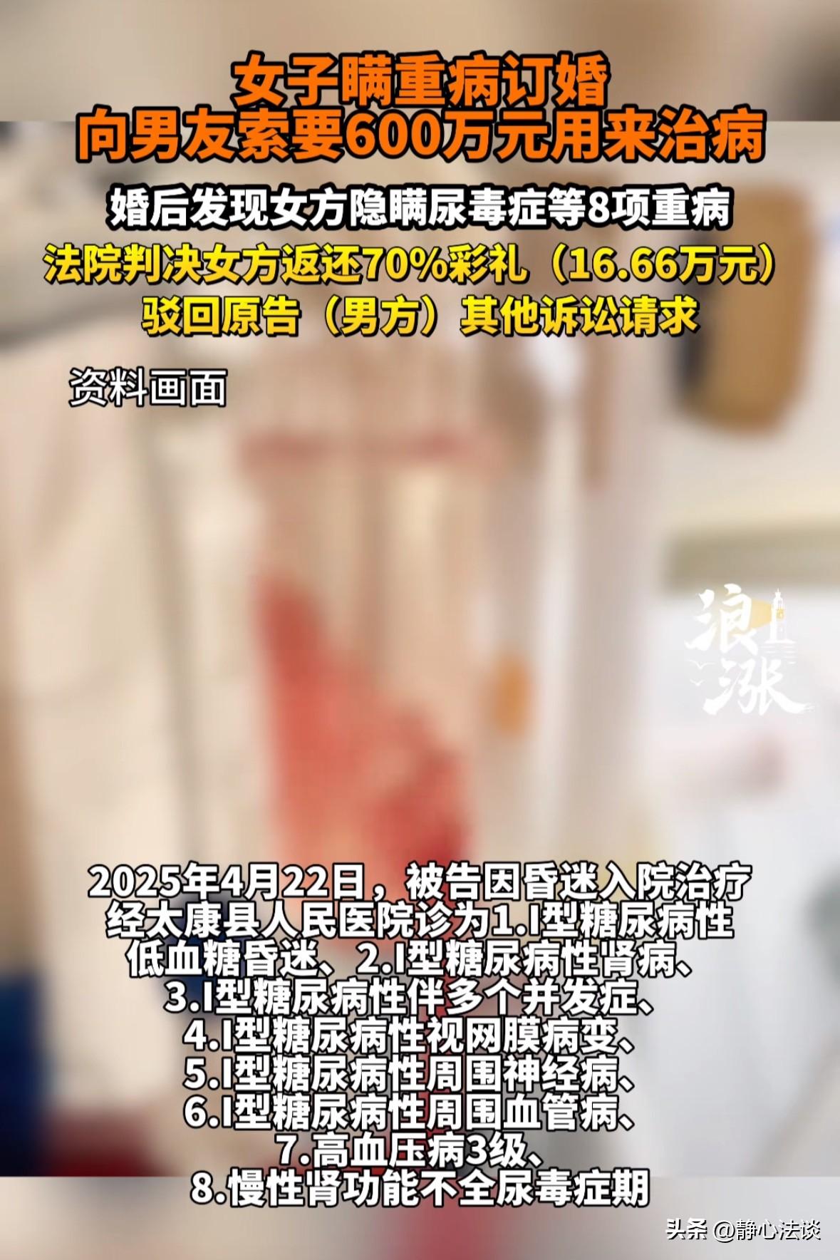 河南周口,男子和相识2天的女子闪婚,没领证就先把婚礼办了,并按要求给了18.8万彩礼及三金和车款,合计23.8万,万万没想到,男子婚后才知道新婚妻子竟然患有尿毒症,男子不干了,提出分手,女子:不可能,我跟你结婚了你就要管我,现在你得贷款600万给我治病!男子觉得自己被骗了,要求对方退还彩礼,没想到女子称不可能,有能耐你就去告我,没想到法院最后这样判了! 周先生经媒人介绍认识了张女士,两人一见面就看对了眼。 两人都到了该结婚的年纪,还有媒人在中间肯定靠谱。 于是两人在2025年1月7号就按当地习俗订了婚,前后满打满算才认识48小时。 为了这场婚事,周先生掏空家底,按张女士要求给了18.8万彩礼,5万元的三金和车款,加起来有23.8万。 虽然这钱不少,但周先生眼里,这钱该花,毕竟自己是奔着过日子去的,是给老婆的保障。 可他不知道,自己递出去的不是彩礼,是给一个绝症病人的救命钱。 订婚后,两人按流程办了婚礼,住到了一起,只是没领结婚证。 周先生满心欢喜等着好好过日子,可张女士的状态一直不对劲,脸色差、没精神,动不动就累得不行。 周先生只当是刚结婚忙前忙后累着了,还心疼地让她多休息,压根没往坏处想。 直到2025年4月,张女士突然在家昏迷,被送到医院抢救,周先生才拿着诊断书才得知真相。 纸上清清楚楚列着8项重病:1型糖尿病性低血糖昏迷,1型糖尿病性肾病,糖尿病伴多个并发症,视网膜病变,周围神经病,周围血管病,高血压3级,慢性肾功能不全尿毒症期。 每一项都是足以拖垮一个普通家庭的绝症,更何况是8项叠加。 周先生拿着诊断书,脑子一片空白。 他这才意识到,为什么妻子总是没精神,为什么订婚前对自己的身体状况只字不提,为什么刚订婚就急着要彩礼。 更让他崩溃的是,张女士醒过来后,第一句话不是道歉,而是理直气壮地要求周先生贷款600万,给她治病。 600万,说得轻松,对一个普通家庭来说,是几辈子都挣不到的天文数字。 周先生彻底懵了,他终于反应过来,这场看似仓促的订婚,其实从头到尾就是一场骗 局。 对方从一开始就没想着跟他过日子,只是把他当成了能给自己治病,填无底洞的冤大头。 后来张女士出院,周先生提出好聚好散,不可能贷款给她看病,要她把彩礼退回来。 可张女士直接把他拉黑,放话:想退彩礼不可能,有本事你去起诉。 周先生一气之下将张女士起诉到法庭。 有人说周先生太傻,见两面就订婚,20多万说给就给,不长心眼。 也有人说这女的也可怜,实在没办法了,才出此下策。 可同情归同情,道理归道理,张女士在明知道自己身患重病,随时可能有生命危险,却在订婚时刻意隐瞒。 以结婚为名义索要彩礼,甚至在婚后要求男方贷款600万给自己治病,这已经不是简单的隐瞒,而是欺诈。 法院审理,周先生和张女士虽办了婚礼,但并没办理结婚登记,在一起也只有几个月。 事后周先生发现张女士隐瞒病情,并要求贷款为其治病导致两人感情破裂。 综合女方过错,法院判决张女士返还70%的彩礼,也就是16.66万元,驳回周先生其他诉讼请求。 我们总说结婚要门当户对,要知根知底,可总有人被爱情冲昏头脑,见两面就订婚,掏光家底给彩礼。 这16万多,根本弥补不了周先生受到的伤害。 而张女士从头到尾没有一句道歉,反而理直气壮,把他的善意当成了理所当然,才最让人寒心。 有人觉得张女士也是可怜人,得了重病,走投无路才出此下策。 可可怜之人必有可恨之处,自己的苦难,不能建立在别人的痛苦之上。 你得了病,是你的不幸,但你不能把自己的不幸,强行转嫁到一个无辜的人身上,用欺骗的方式,毁掉别人的人生。 《民法典》第1042条:禁止包办、买卖婚姻和其他干涉婚姻自由的行为。禁止借婚姻索取财物。 彩礼是以结婚姻为目的,若一方以婚姻为幌子索要财物,本质上属于借婚姻索取财物,违反婚姻自由原则。 张女士隐瞒病情索要23.8万彩礼,且后续无正当理由拒绝返还,其行为违背婚姻自愿原则,为彩礼返还提供必要条件。 《彩礼纠纷案件适用法律若干问题的规定》第5条:双方已办理结婚登记且共同生活,离婚时一方请求返还彩礼的,人民法院一般不予支持;但共同生活时间较短且彩礼数额过高的,可结合彩礼使用、双方过错、当地习俗确定返还比例。 本案中双方仅共同生活数月,还没领证,且女方存在隐瞒重大疾病的重大过错。 彩礼未用于大额共同支出等事实,酌定返还70%的比例,既符合规定,也兼顾公平原则。 对此,你怎么看这件事! @静心法谈 ,学法辩是非,懂法不吃亏!