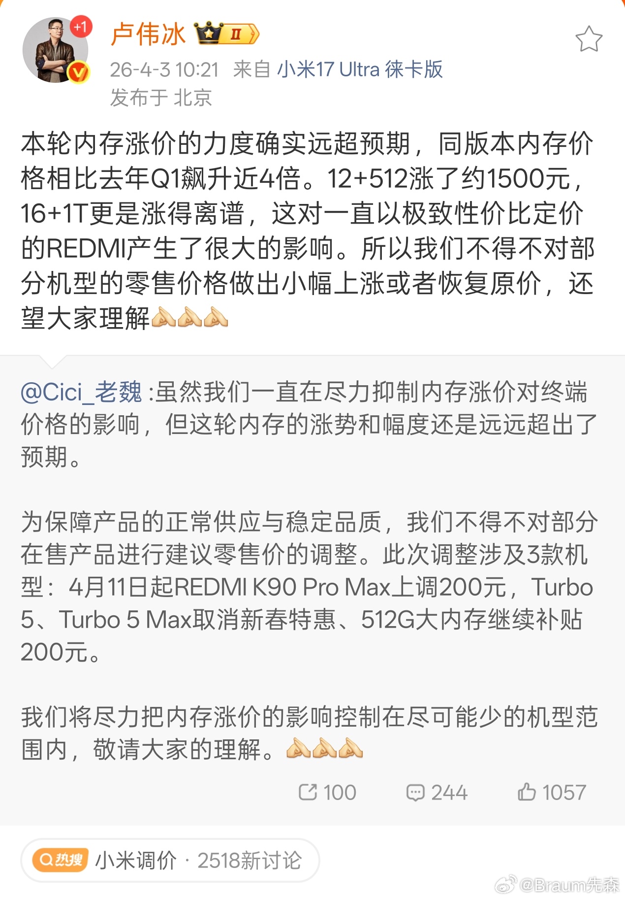 红米坚持了一阵才涨价还可以了,尤其是2K档位的大容量机,高成本没人躲得过。小米调价