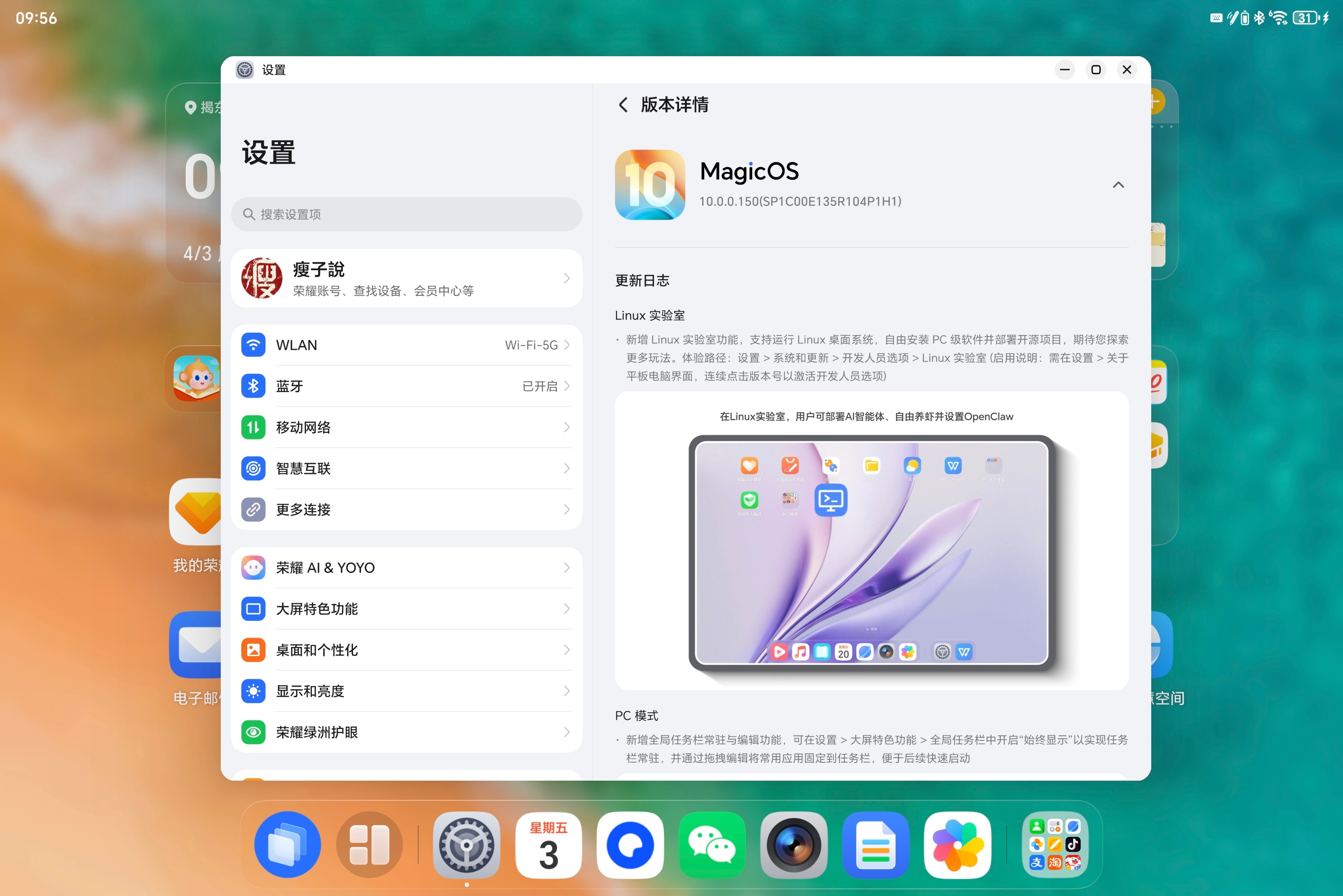 MagicPad 3的150版本也更上了。Linux实验室、PC交互、极客中心、屏幕扩展......感觉可以折腾。研究研究怎么玩。官方要不再多整点教程,荣耀的龙虾池来了,哈哈哈。平板养虾好像也合适~