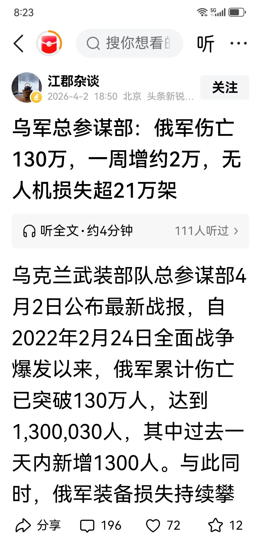 “战场上没赢,数字上准赢”,莫斯科指日可待,基辅稳如泰山。一一乌军战报:俄军开战以来伤亡130万人,乌军阵亡5.5万人。