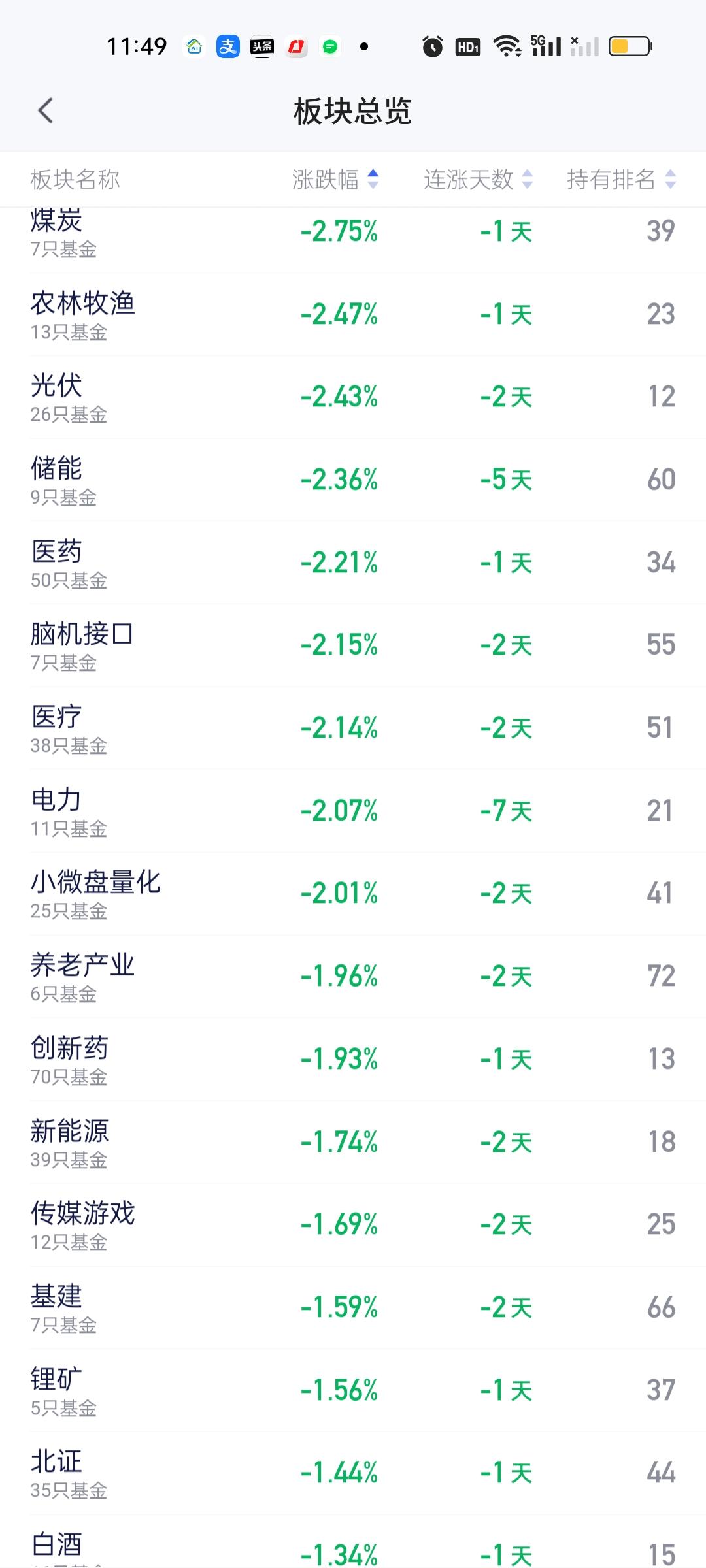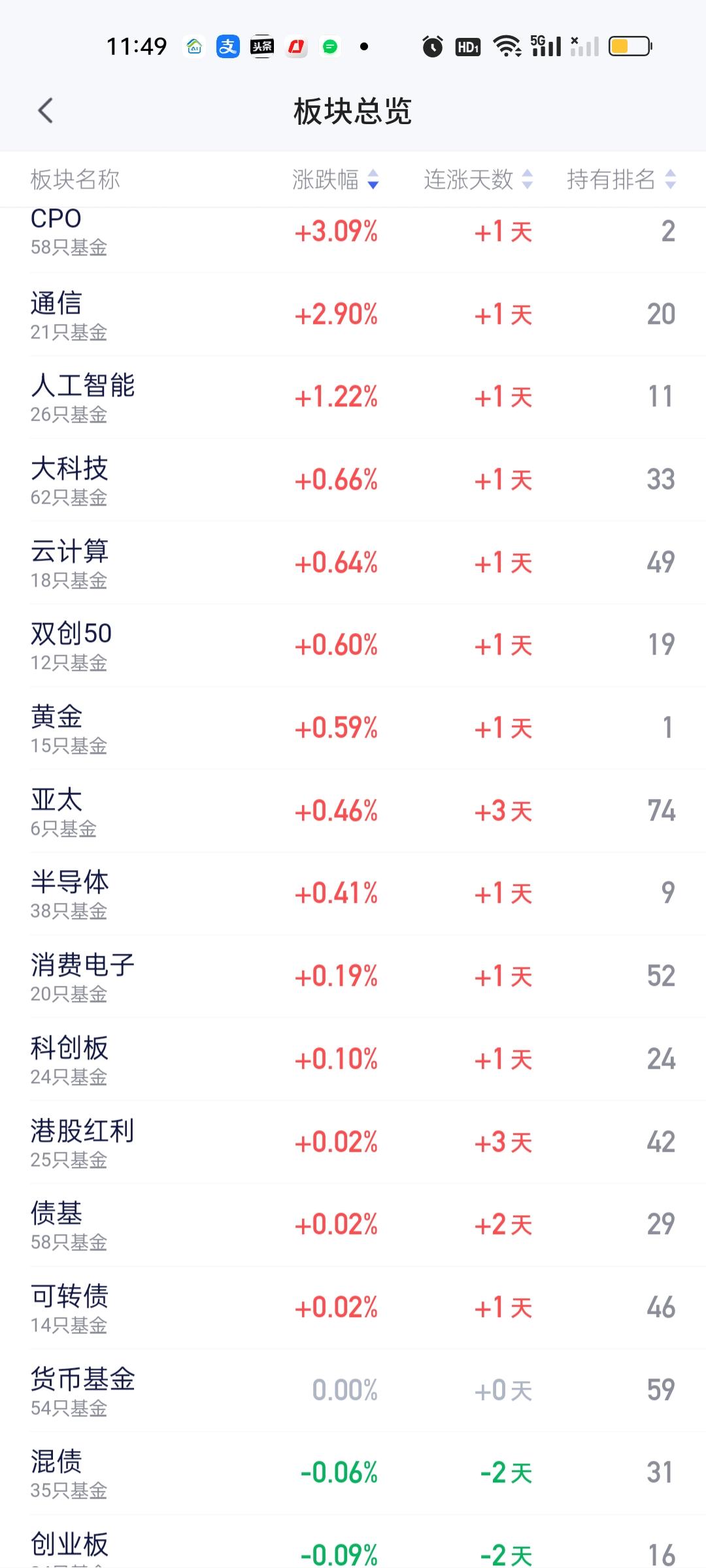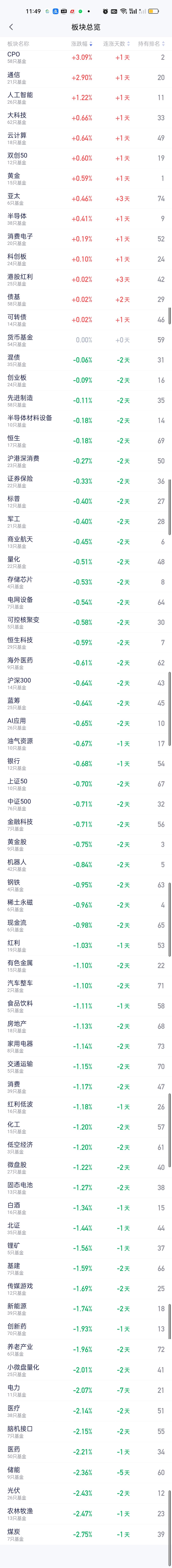 从中午收盘后的板块榜来看,涨幅方面,CPO和通信是一骑绝尘的。后面还有人工智能,大科技,云计算,双创50,黄金,亚太,半导体,消费电子,科创板等。 跌幅方面,今天下跌的板块非常多,但大跌的并没有。跌幅在2%以上的板块有煤炭,农林牧渔,光伏,储能,医药,脑机接口,医疗,电力,小微盘量化。