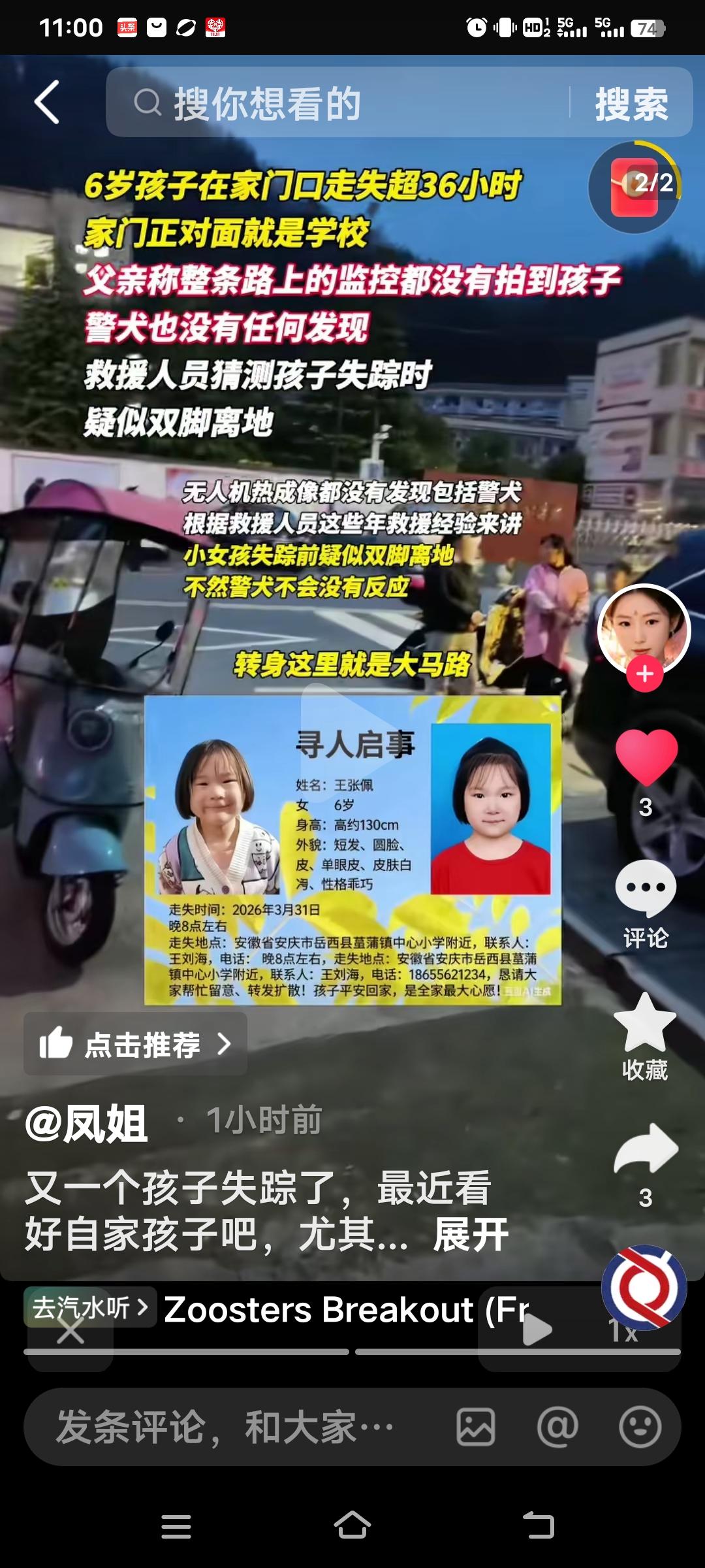 安徽岳西县发生了一件揪心的事,6岁女童王张佩走失已超36小时。3月31日晚8点,她拿着车钥匙下楼给妈妈,20分钟后妈妈回家,却发现孩子不在房间里了。 她的爸爸称,孩子最后出现的位置就在自家门口的楼梯口,一转眼就没了踪影。家对面就是学校,旁边就是马路。他们挨家挨户找过了,都没见到孩子。 无人机、救援队、警犬都出动了,依旧没查到孩子的踪迹。监控死角也没拍到孩子。凭借救援队多年的经验,疑似孩子失踪时是双脚离地的! 大家的心都揪起来了,这孩子难道是遇到劫匪了,不然怎么会凭空消失呢?这可是自家熟悉的地方,又不是在外面游玩时走失,真让人着急啊!希望更多人看到,多一个人知道就多一份帮助!女童寻人 走失女娃