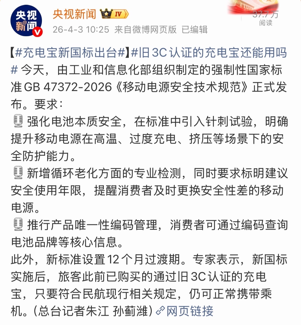 "史上最严"移动电源安全标准来了,27年4月1日全面执行。充电宝新国标出台