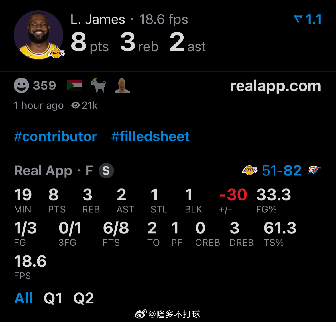 出战19分钟,3投1中得到8分,罚球8中6,外加2失误,正负值-30