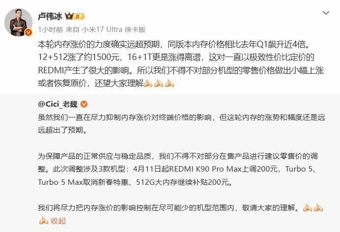 小米调价之前小米卢伟冰就说过“友商涨价,很理解,都很难,我们也扛的很肉疼。”