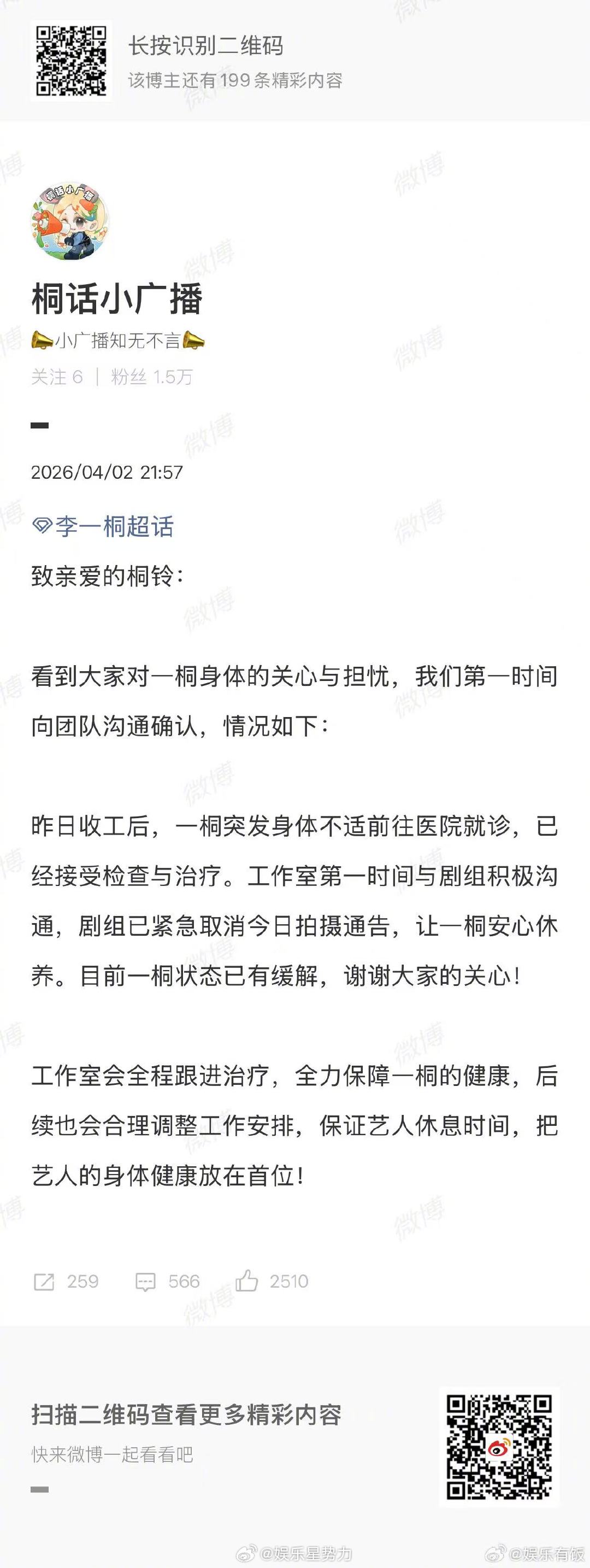 对接回应李一桐夜晚进急诊 有网友深夜在急诊偶遇穿着睡衣、被搀扶就医的李一桐。4 月 2 日晚,其团队回应表示,李一桐是收工后突发不适前往就诊,现已接受治疗并有所缓解。剧组已取消当日拍摄行程,工作室也会调整后续工作,全力保障她休养恢复,希望姐姐安心休息,早日康复呀~