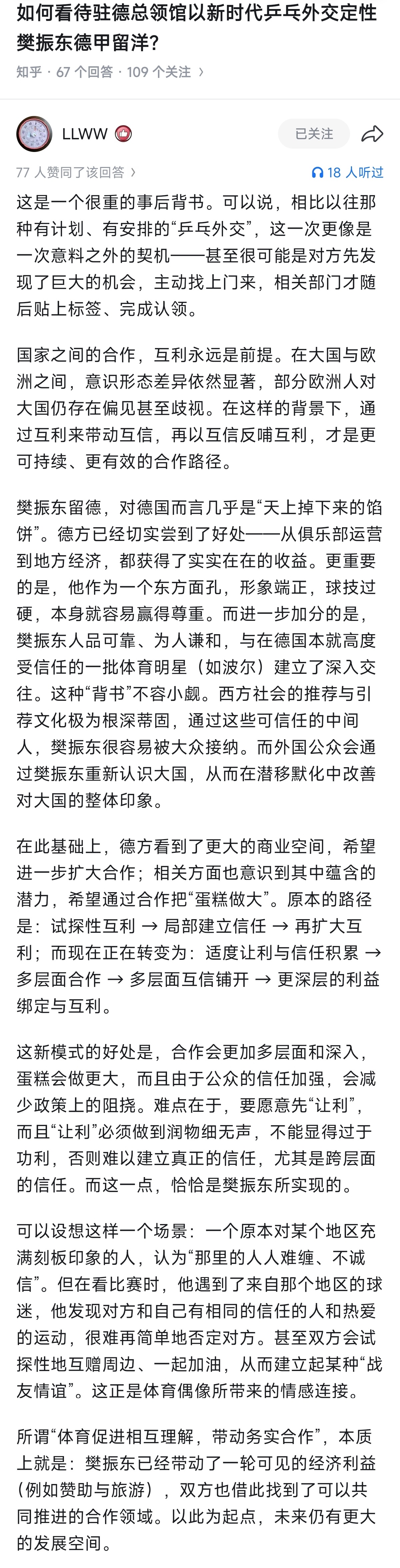 这一次樊振东留德促成的“乒乓外交”更像是一次意料之外的契机。让“体育促进相互理解,带动务实合作”从理念变成了实质化的联结。看懂这份以球为桥、以心换心的力量,就懂樊振东这份 quietly great 的伟大。