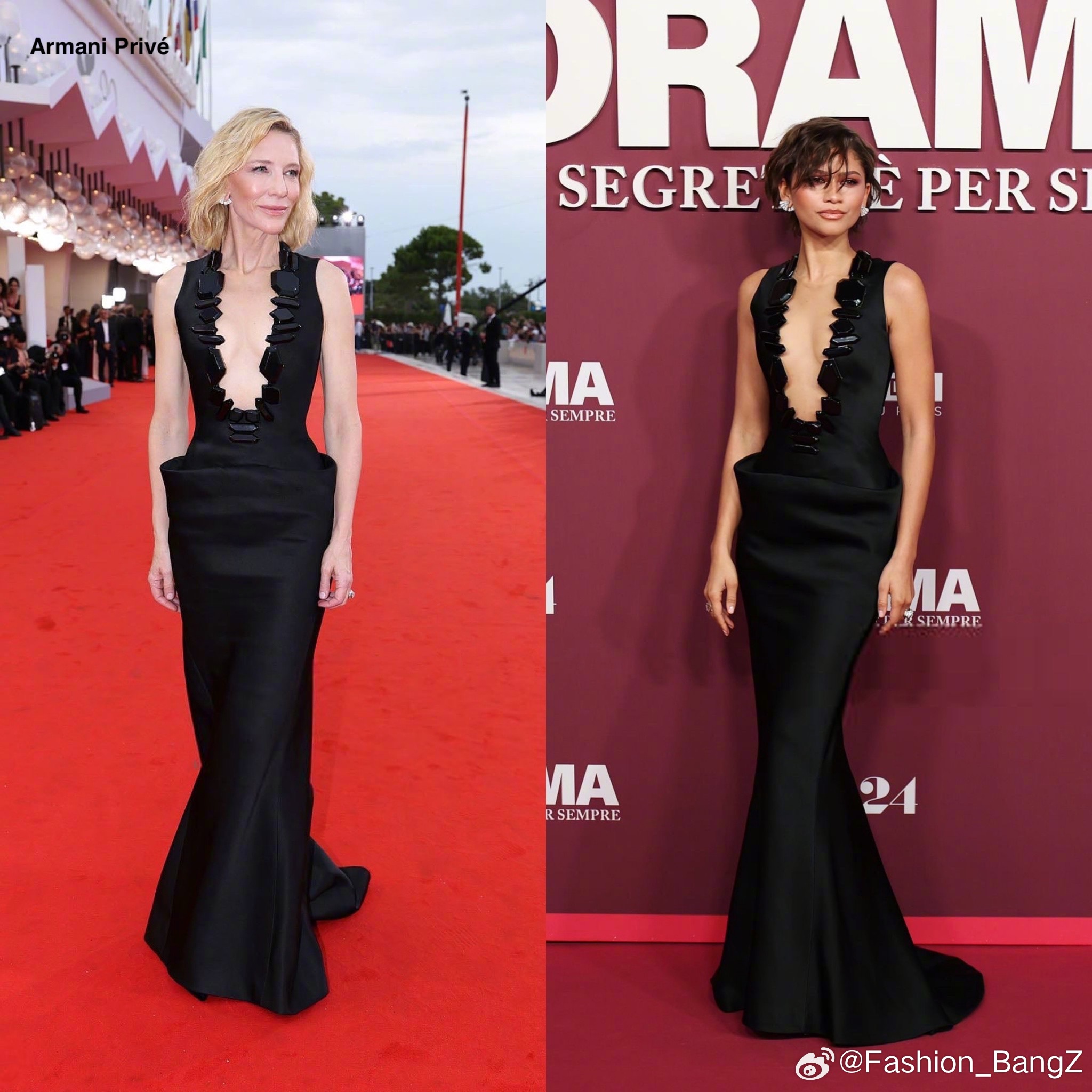 “Something Borrowed”:罗马站,Zendaya 从 Cate Blanchett 手中借出 Armani Privé 礼服。两位红毯女王跨越时空相遇,颇有惺惺相惜的意味。