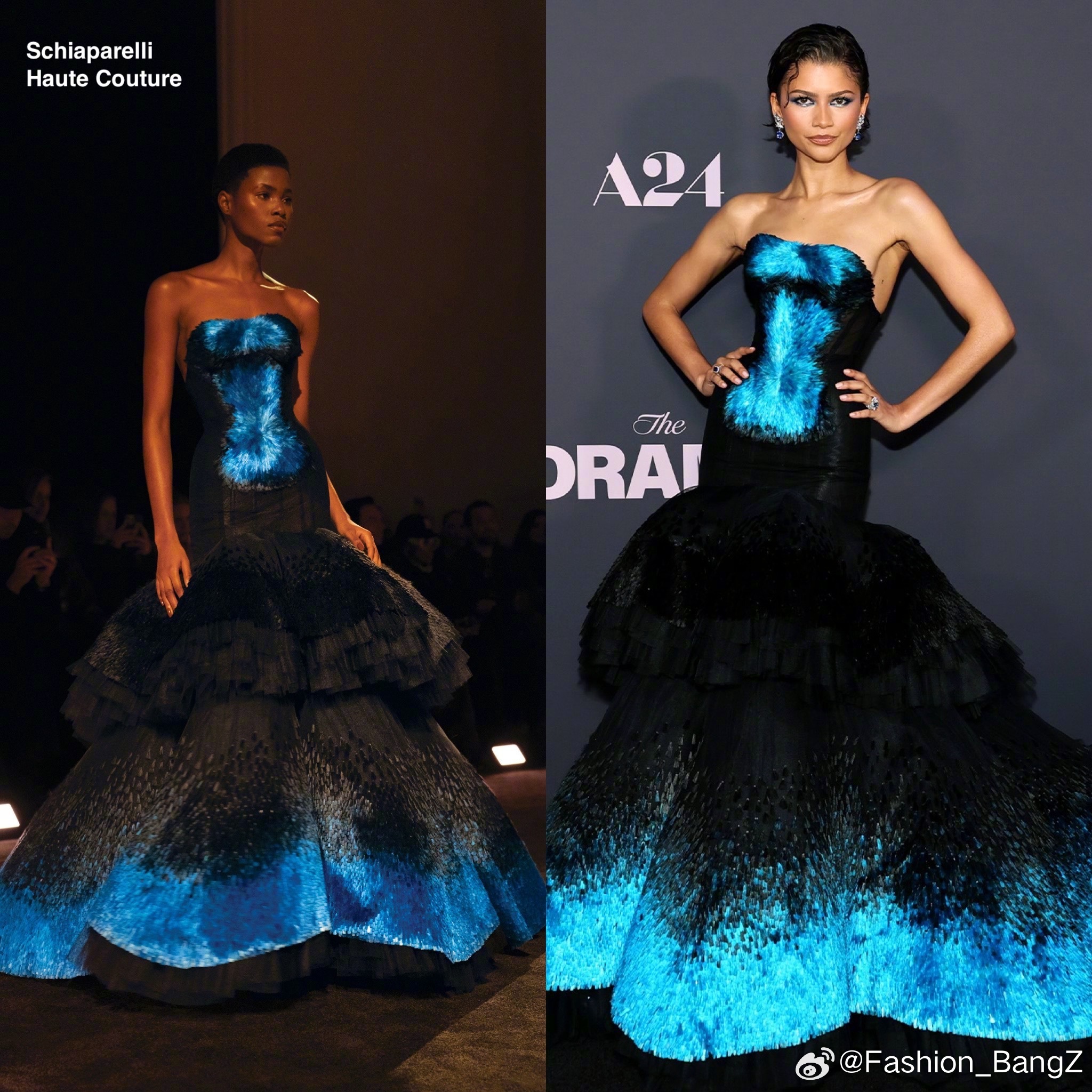 “Something Blue”:纽约首映礼、也是最后一站,Zendaya 选择 Schiaparelli 高级定制礼服亮相。眼影、耳环完美呼应,一抹神秘典雅的蓝色。