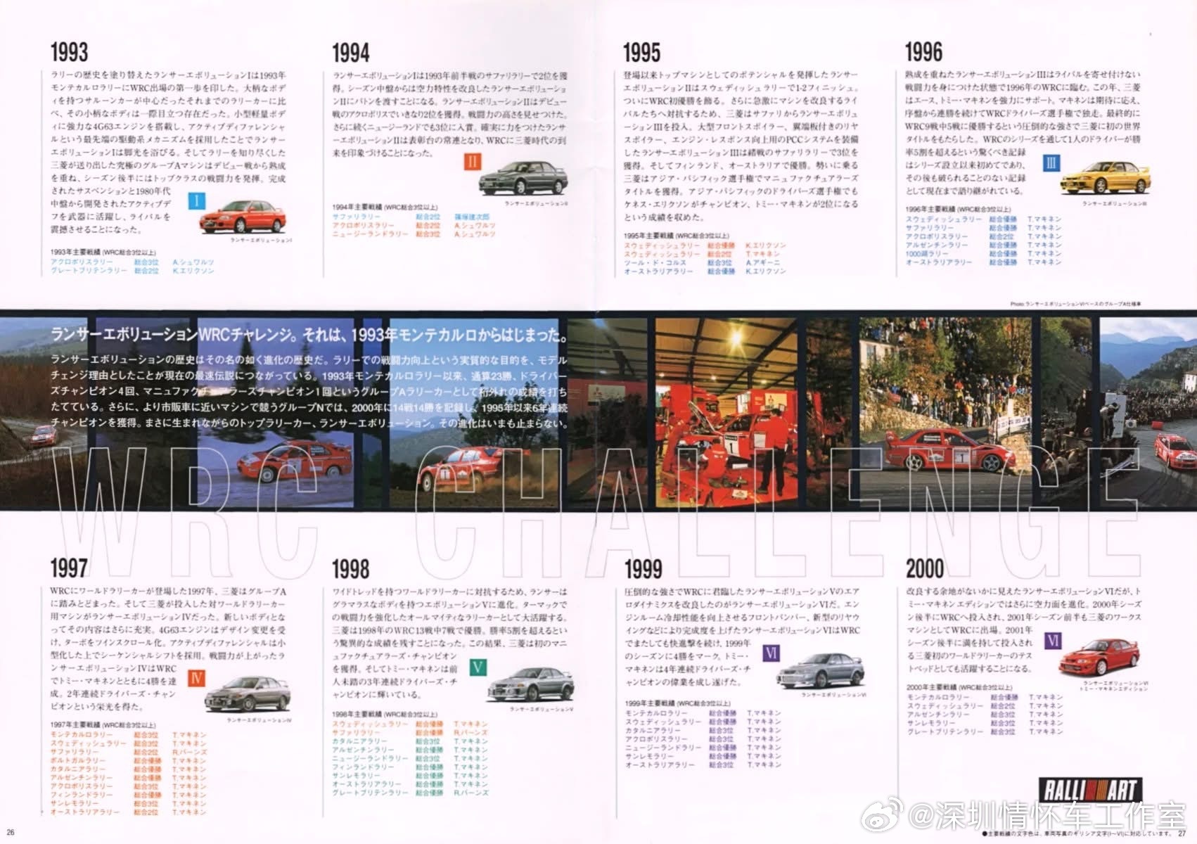 2001三菱 Lancer Evolution VI(CP9A,1999–2001) 是EVO王朝的巅峰之作,也是WRC四连冠的终极街车版本,更是JDM黄金时代的图腾。一、诞生背景• 时间:1999年1月推出,2001年3月停产• 代号:CP9A(与V代同平台)• 目的:适配WRC新空力规则(套件须藏于车体内)• 定位:强化散热、耐用、赛道响应,马力维持280PS(日本君子协定)二、核心技术(创造历史的硬件)• 4G63 2.0T 红头神机◦ 更大中冷、机油冷却、活塞顶喷油冷却◦ RS版首次量产钛铝涡轮(Ti-Al),响应极快◦ 280PS / 373N·m,潜力轻松破400匹 • 底盘与四驱◦ AYC主动偏航控制+ACD主动中央差速器◦ 强化悬挂、加宽轮距、更硬防倾杆◦ 双翼片尾翼(下压力更强、风阻更低)EVO VI是Tommi Mäkinen四连冠的最终座驾:• 1999年:蒙特卡洛、瑞典、新西兰、圣雷莫 4胜