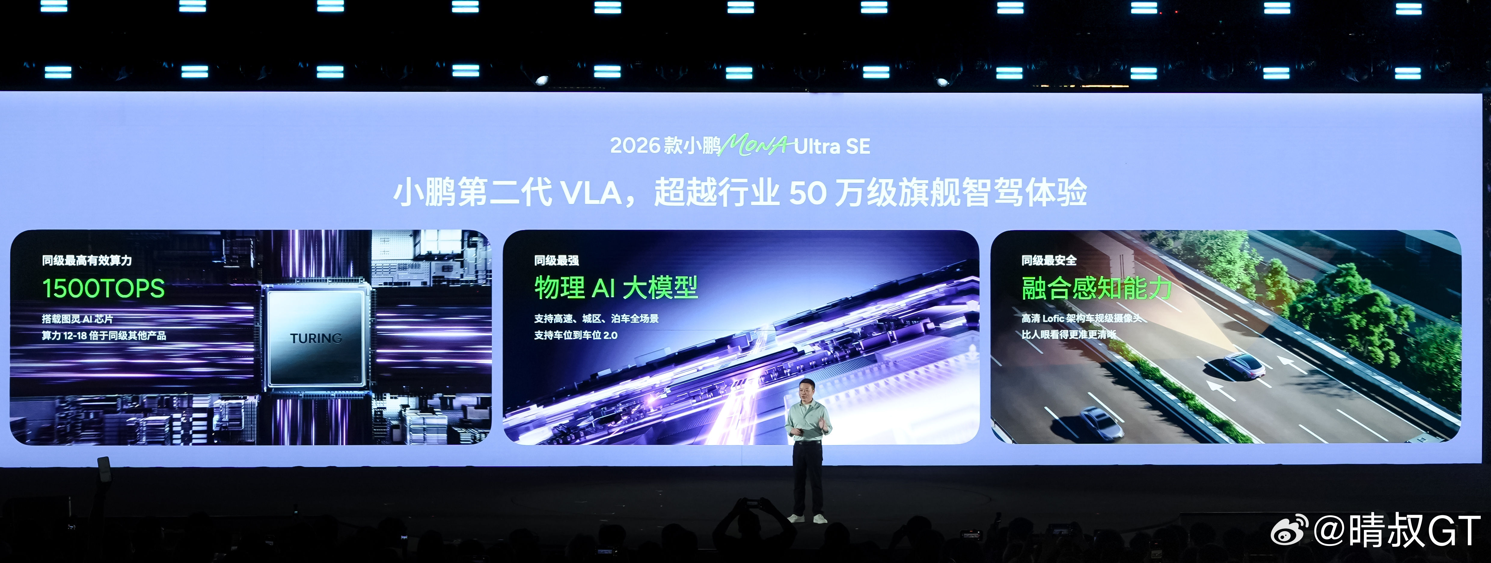 为满足不同用户的智驾需求,新车提供Max版和Ultra SE版双算力版本可选,兼顾高阶性能与实用体验,覆盖全场景出行。其中,Ultra SE版配备双图灵AI芯片,有效算力高达1500TOPS,搭载小鹏第二代VLA,这是一套面向L4时代的物理世界模型,不仅安心丝滑,全场景都能开,而且像老司机一样高效。而Max版搭载单颗图灵AI芯片,有效算力达750TOPS,目前搭载小鹏第一代VLA,2026年第三季度将开启小鹏第二代VLA蒸馏版上车,在驾驶体验、运行帧率、响应时延与稳定性等维度,完整保留小鹏第二代VLA的核心能力。作为“智驾老司机”,欧阳娜娜在活动现场分享了自己的真实智驾体验,并表示:开智驾,只有0次和无数次。最爱全场景NGP、人机共驾、智能泊车、车位到车位以及循轨倒车等5大高频实用功能,彻底解决了日常出行的诸多痛点。