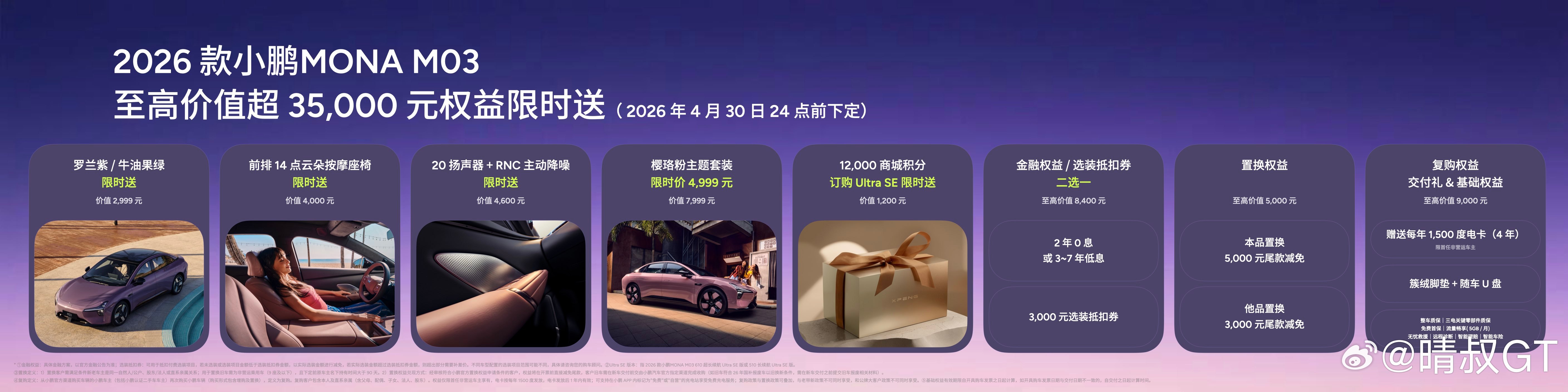 2026年4月2日2026款小鹏MONA M03正式上市。作为小鹏面向年轻用户打造的AI智能纯电轿跑,新车以“全方位对标20万级车型”为开发基准,在外观设计、智能科技、驾乘舒适与主被动安全等核心维度实现全面进化,致力于为年轻用户带来越级出众的用车体验。本次上市共推出6款版型,官方指导售价依次为:540长续航Plus 11.98万元、640超长续航Plus 12.98万元、510长续航Max 12.98万元、610超长续航Max 13.98万元、510长续航Ultra SE 14.18万元及610超长续航Ultra SE 15.18万元。品牌同步推出上市专属权益,即日起至2026年4月30日24点前下定2026款小鹏MONA M03,限时送至高价值超35,000元权益。