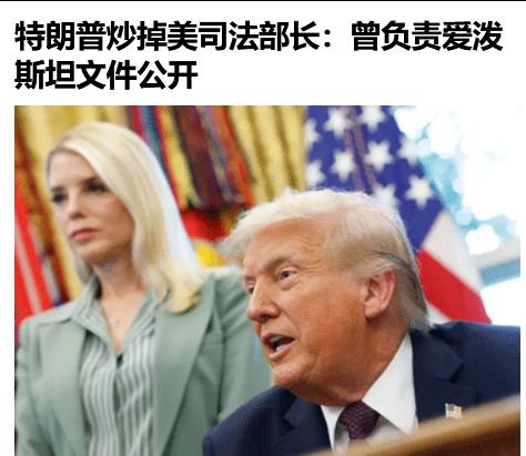 特朗普炒掉美司法部长:曾负责爱泼斯坦文件公开。。。更加证实川破确实被鱿鱼捏着蛋蛋了。。 。 川破被她害苦了,要不是这些把柄他至于被以色列逼着丢这么大个人吗?必须收拾 。 最让川普震惊的事,是邦迪听命于犹太人而不是他,爱泼斯坦案文件公布的开关掌握在犹太人手里。现在对伊朗的作战已获大胜,大赢之后总要拿回控制权的,不过有个过渡期,45天,对伊作战还不能停!