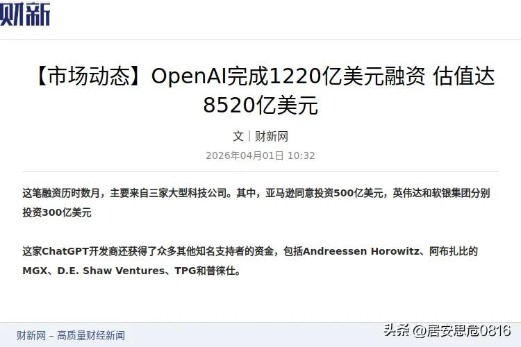1220亿到账,OpenAI估值直奔万亿,看看这轮融资名单就知道AI时代的权力归谁了 亚马逊500亿领投,英伟达软银各300亿,巨头们已经不装了,赢者通吃的游戏正式开打 🔥