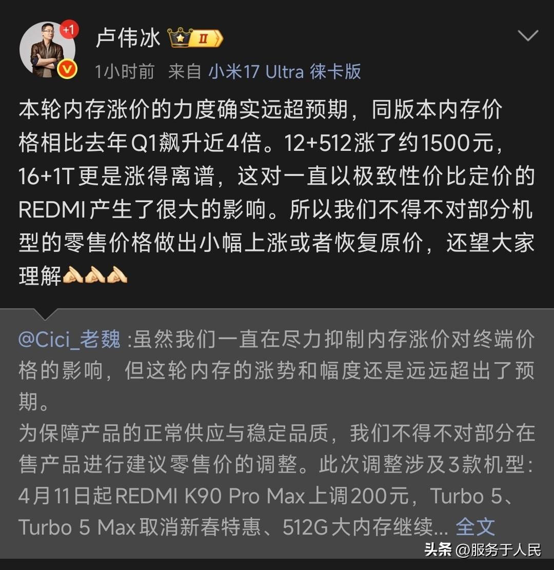 🔥REDMI官宣涨价,幅度不算大! 没错,内存价格疯涨,对红米“极致性价比”理念而言,是致命的,伤害最大,同样涨500的话,怎么体现得更极致呢? 这次成本飙升,同版本价格同比暴涨近4倍,12+512GB配置成本增加约1500元,对主打“极致性价比”的红米来说,无异于釜底抽薪。红米的极致性价比在于“同等配置价格最低”,当核心元器件成本失控,红米该如何? 然而,涨价对红米的品牌伤害远大于其他品牌。红米用户的价格敏感度极高。同样涨价500元,放在旗舰机上可能只是“微调”,但在红米这种走量的中低端机型上,就显得“不那么性价比”了。一旦失去价格优势,红米在用户心中的核心价值就会动摇。 卢伟冰提到的“不得不小幅上涨或恢复原价”,其实是一种非常被动的策略。通过取消特惠、恢复原价这种“软涨价”方式,试图降低用户的痛感。但这次被迫涨价,可能会让用户觉得:“连红米都这么贵了,我为什么不直接加点钱买小米或者其他品牌?”这反而可能阻碍其品牌向上突破。