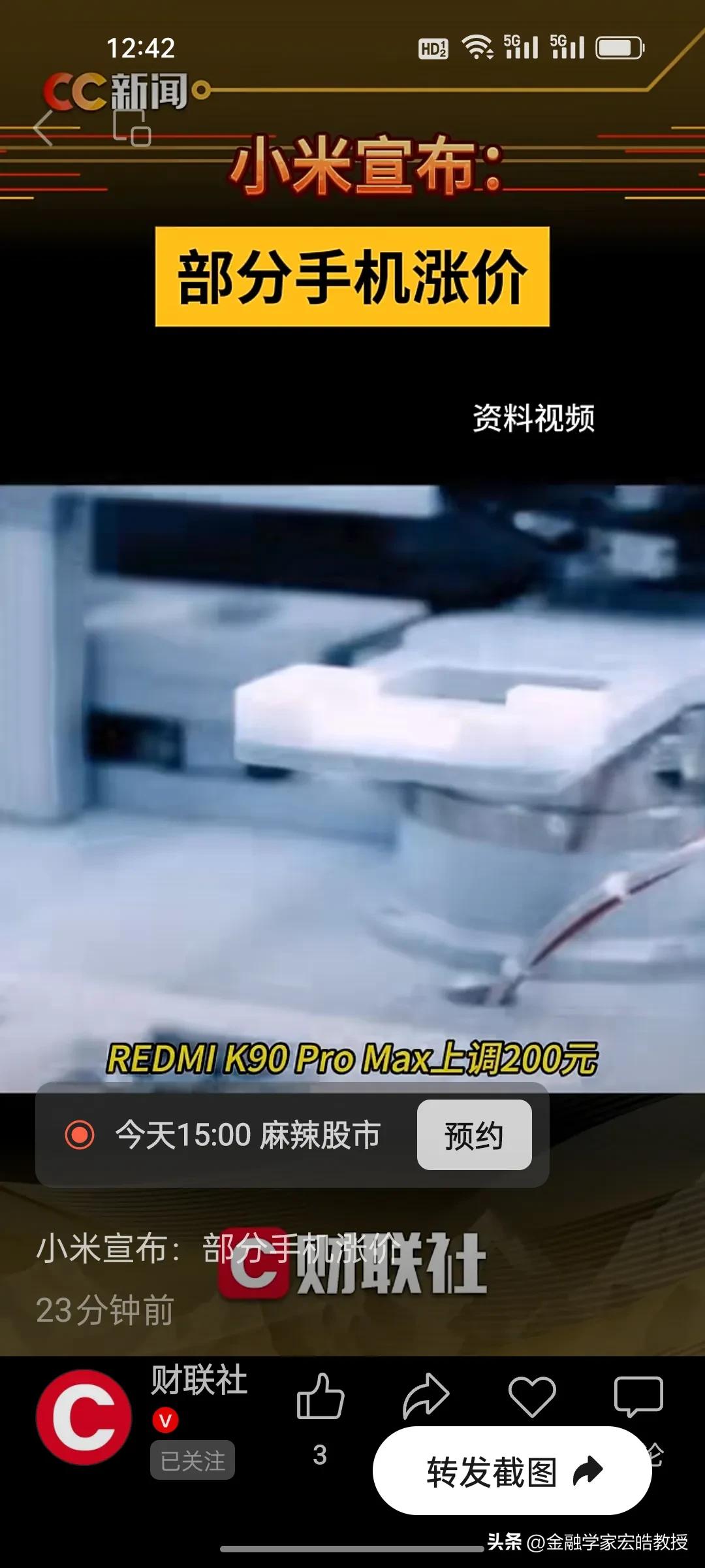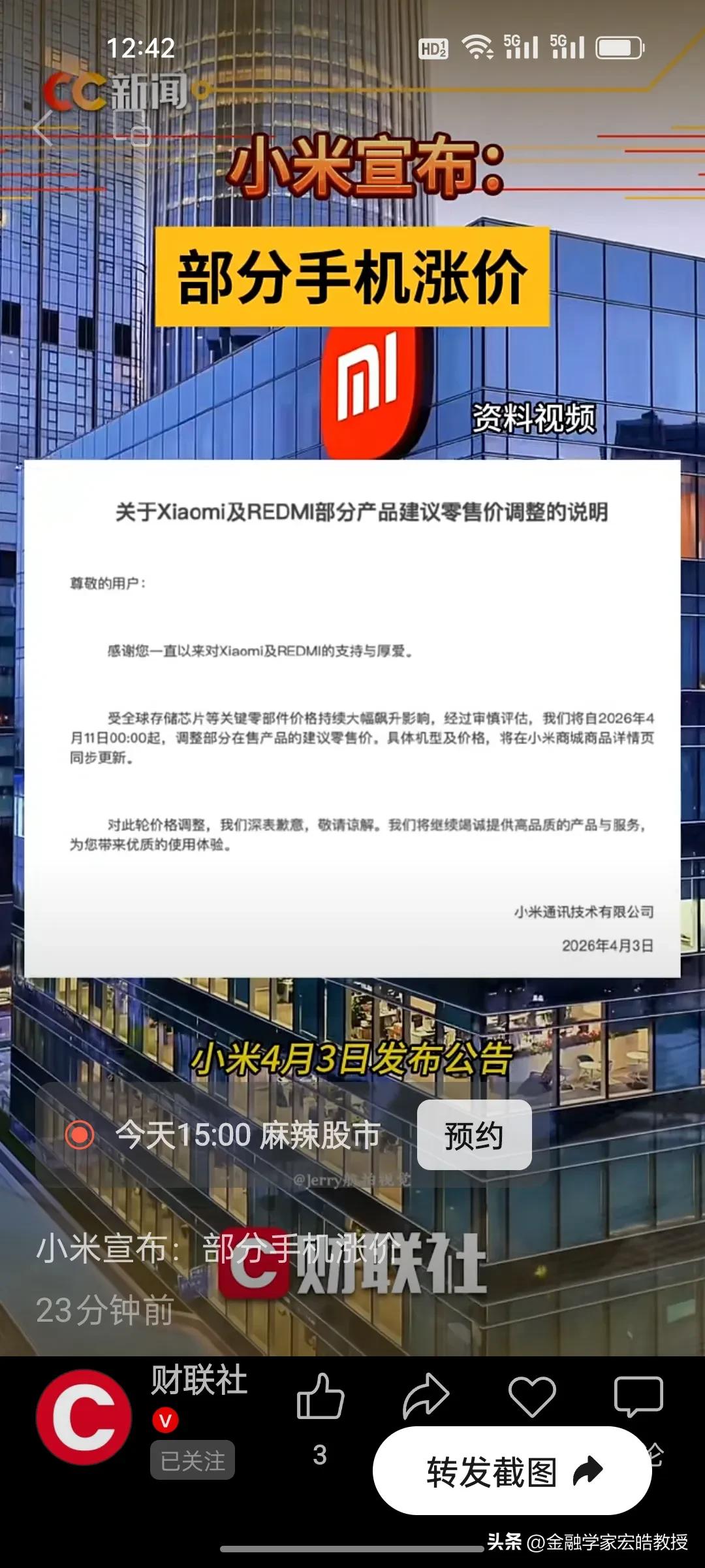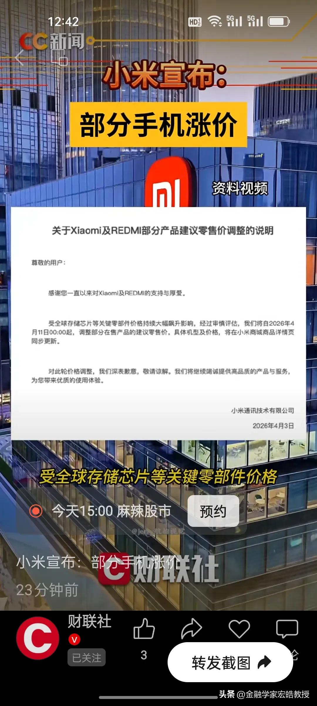 刚刚,小米官宣手机涨价!手机、家电集体涨价潮来袭! 谁能想到,最能扛的小米手机竟然也要涨价了!今天,小米正式官宣:受全球存储芯片等关键零部件价格大幅飙升影响,自4月11日0点起,部分在售手机上调建议零售价。 不过,这次涨价倒是对小米高端化转型迎来契机。涨价为品牌升级提供了缓冲,小米借此提升产品溢价,摆脱“性价比”标签,向高端市场突围,提升品牌长期价值。 不止手机,家电圈早已掀起涨价潮:美的、格力、海尔等头部品牌先后上调空调、冰箱等大家电价格,部分小家电涨幅超10%;生活用品中,卫生纸巾、洗护用品也因原材料、物流成本上涨提价。 核心原因就是上游核心元器件、大宗商品价格持续走高,叠加供应链成本压力。短期看,存储芯片、芯片等核心物料价格仍在高位,涨价潮至少会持续到2026年下半年,直到供应链供需平衡才会缓解。 现在入手刚需产品,真的要抓紧窗口期了!