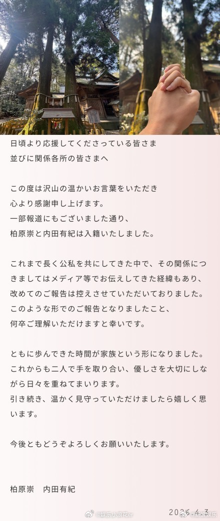 内田有纪回应和柏原崇结婚内田有纪晒与柏原崇牵手照 4月3日,内田有纪官网更新,证实已与柏原崇结婚一事。她表示共同走过的时光,如今化作了“家人”这一形式,未来将继续携手共进,还晒出了两人的甜蜜牵手照,祝福啊祝福!!